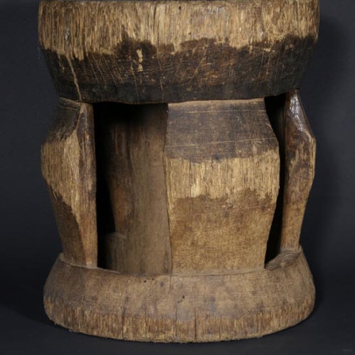 This is a nice example of the stools you find in almost every compound in the African bush. At 16″ tall and 13 1/2″ in diameter (41 x 34 cm diam.) this one is quite large by comparison with most. The vast majority of Africans live in villages rather than cities and most of those live in “compounds”, groups of huts, usually round, each belonging to a member of one family. Furniture is limited; the most common item of furniture is the round stool of which this one is very characteristic though most are much smaller than this one. Most often these common stools are used outside and get moved around quite casually so are not maintained in the way we tend to maintain our furniture; a lot of wear is always common. This one has lots of wear around the sides and the top is very heavily patinated. The base of this one broke in normal use but was still – and remains to this day – useful so it continued to be used even in its imperfect condition.