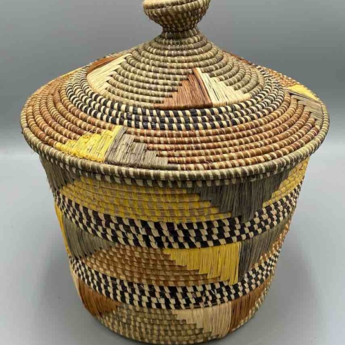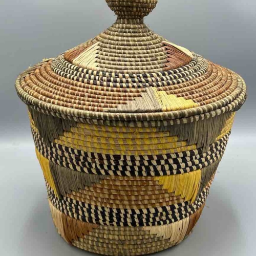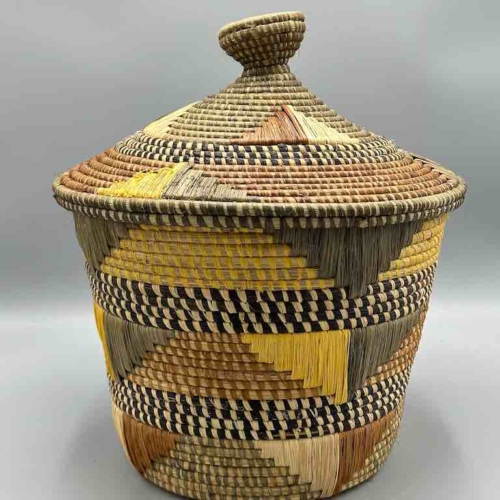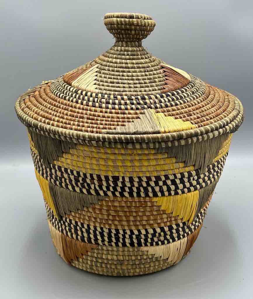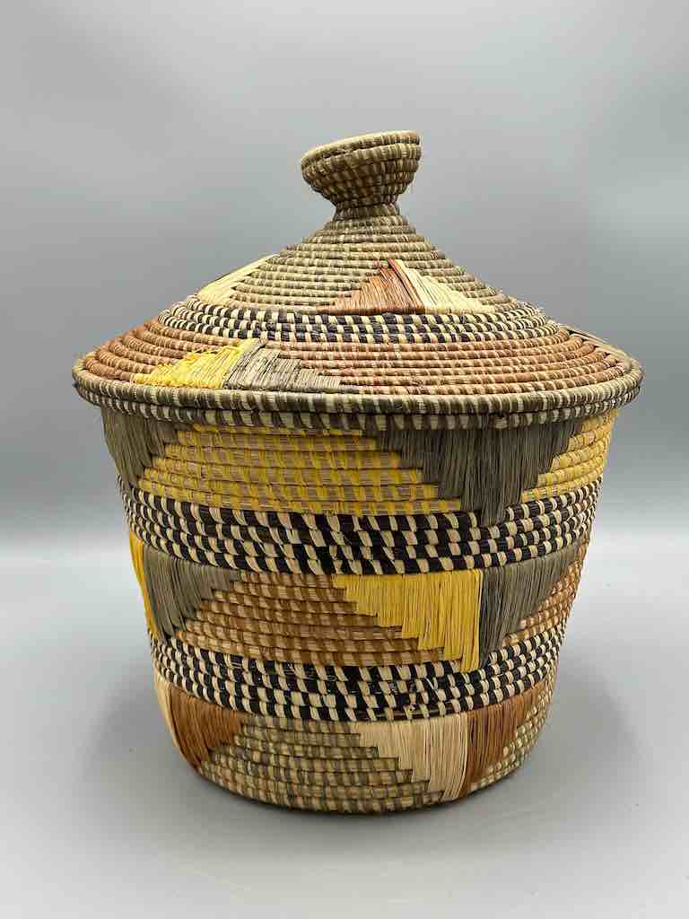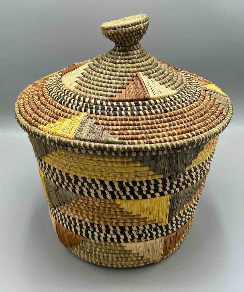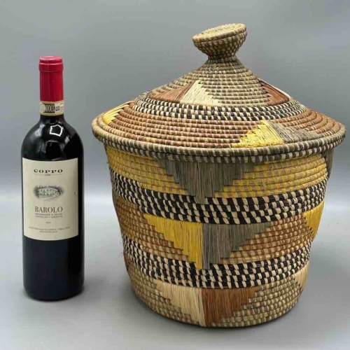 These Batwa baskets are unlike any other African basket. To the coiled grass bound by dyed raffia a supplementary raffia woven design is added to form this extraordinary basket. The Batwa – the Twa people, a “pygmy” people – live in the border area of southwestern Uganda, northwestern Rwanda and eastern Congo, in the area of the Ruwenzori Mountains, in the Bwindi Impenetrable Forest. They live among a native gorilla population just like we live among whitetail deer. 13 1/4” tall x 12” top diameter (34 x 30 cm)