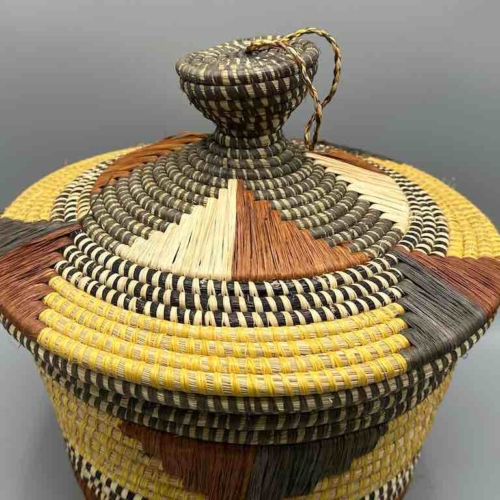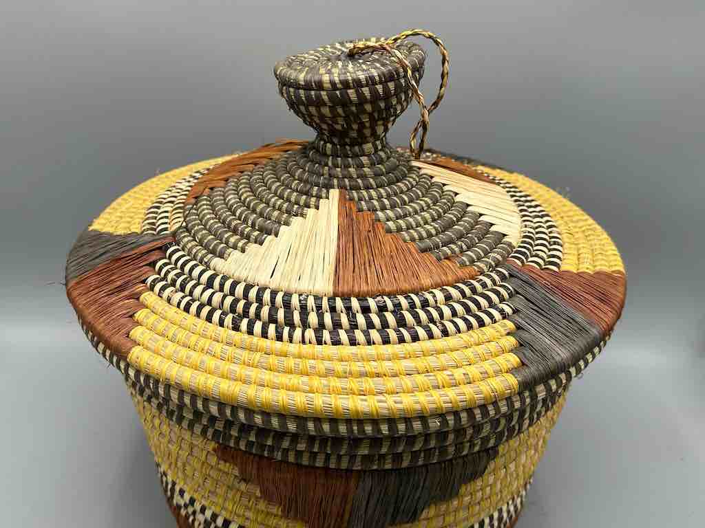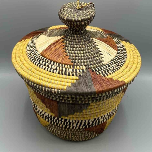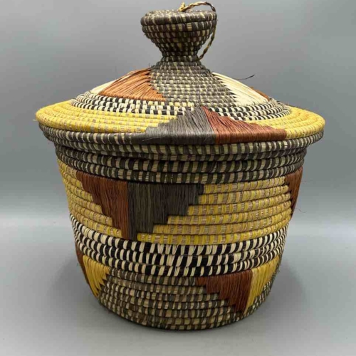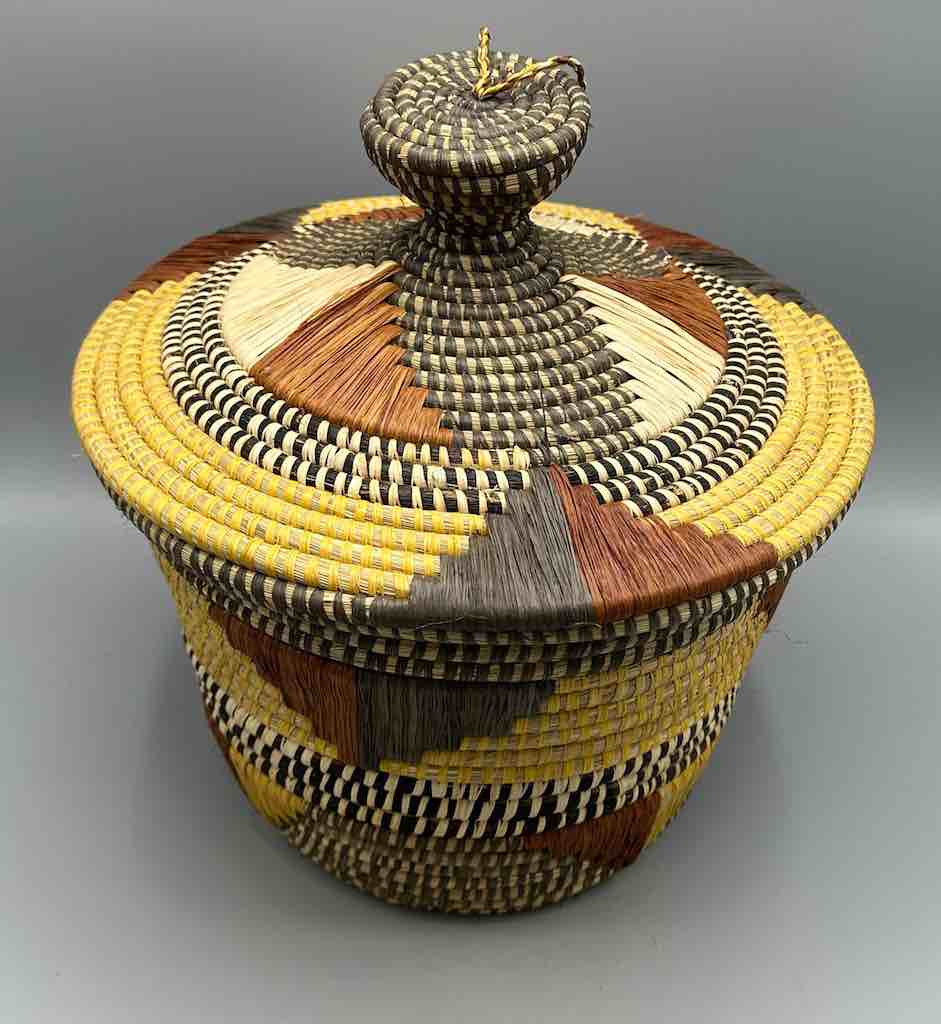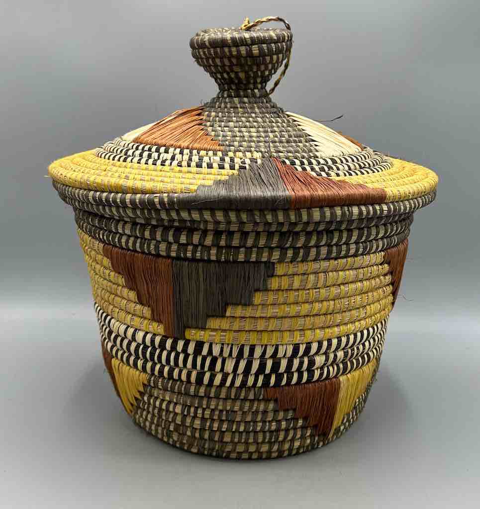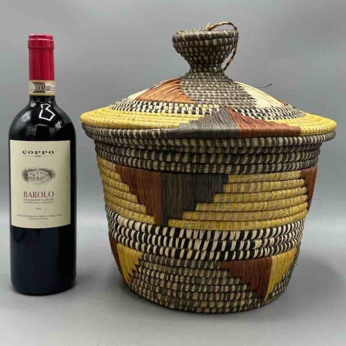 These Batwa baskets are unlike any other African basket. To the coiled grass bound by dyed raffia a supplementary raffia woven design is added to form this extraordinary basket. The Batwa – the Twa people, a “pygmy” people – live in the border area of southwestern Uganda, northwestern Rwanda and eastern Congo, in the area of the Ruwenzori Mountains, in the Bwindi Impenetrable Forest. They live among a native gorilla population just like we live among whitetail deer. 12 1/2” tall x 11 1/2” top diameter (32 x 29 cm)