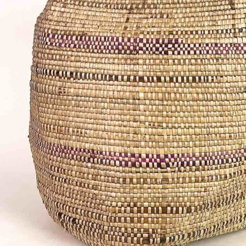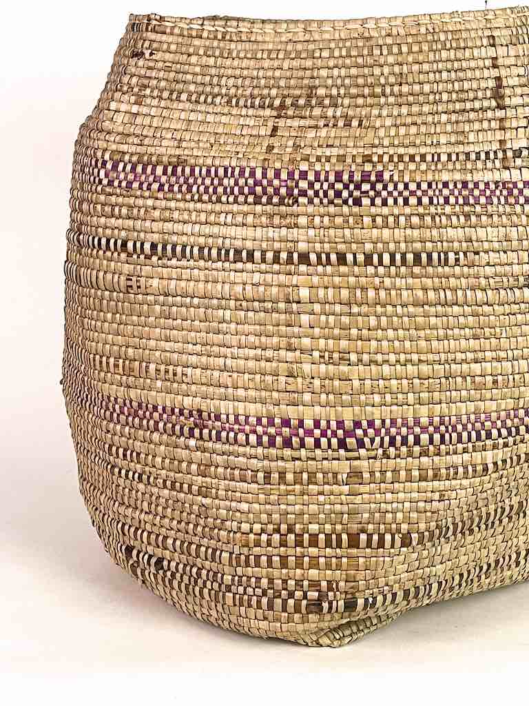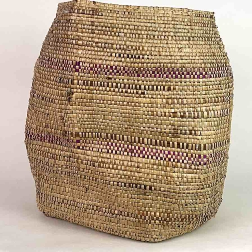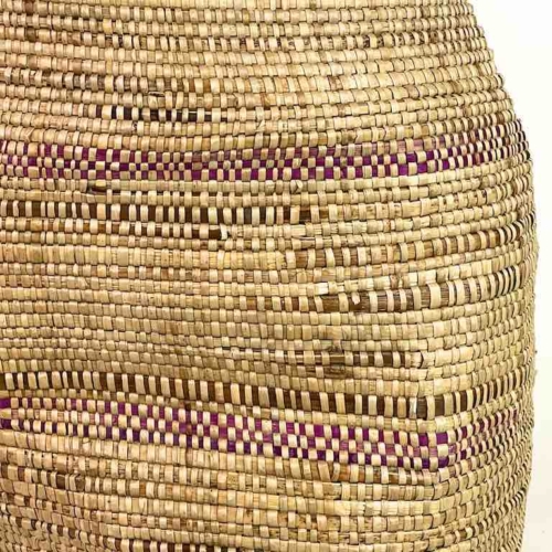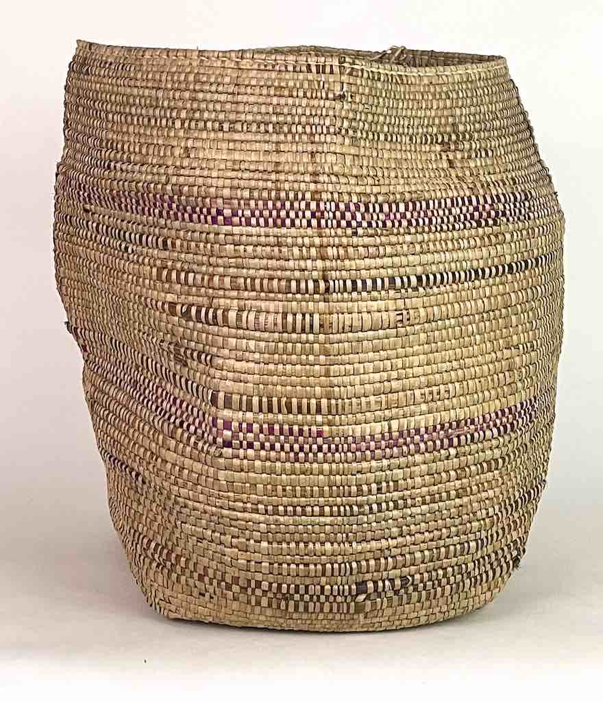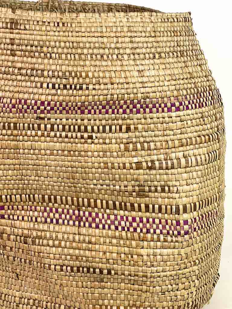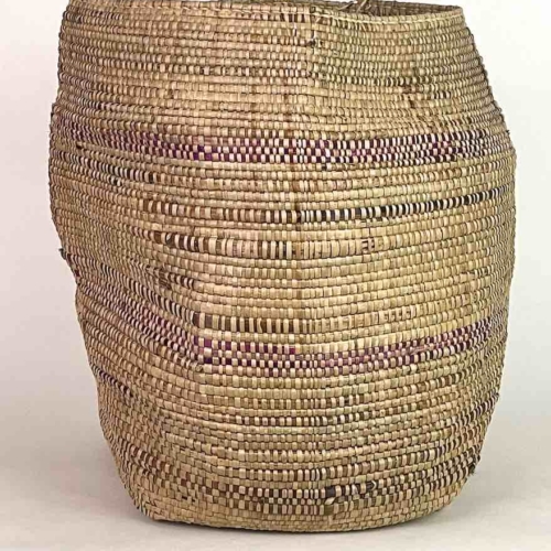 Handwoven from local swampgrass in the lowlands of coastal Togo, West Africa this baskets is the natural color of the straw, decoratively accented with dark green vertical stripes. This basket is not a replica: it is a one of a kind product, originally made for local tribal use. The Mina people in this area of Africa use this basket to carry just about anything they need to carry, to store items and to keep items available in markets for sale. This basket is 17″ tall (43 cm) x 12″ top opening diam. (30.5 cm) x 15″ widest diameter (38 cm)