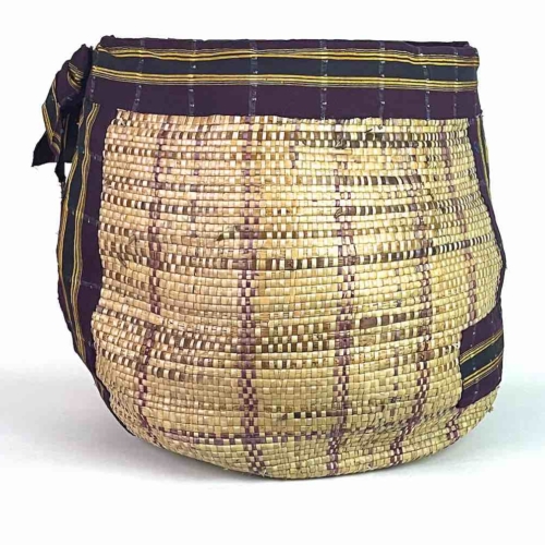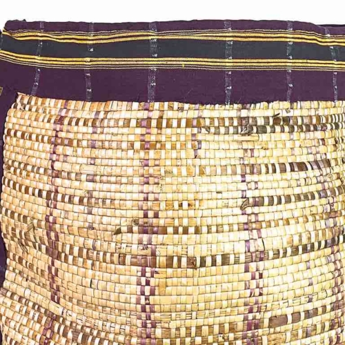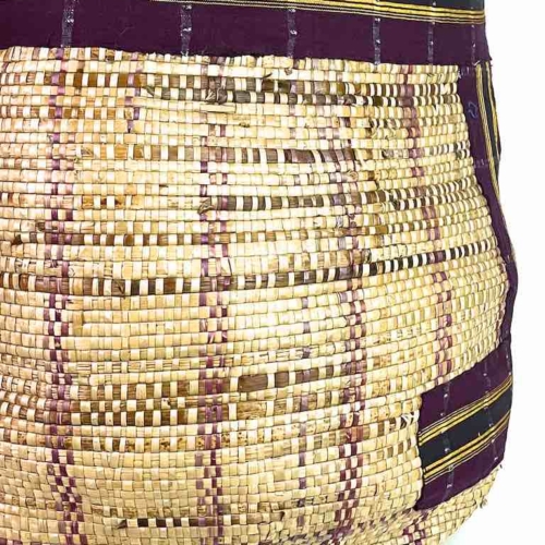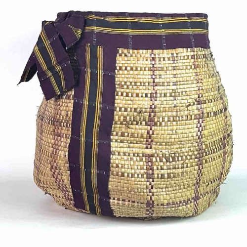 This large flexible deep basket, handwoven by the women of the Mina tribe in coastal Benin, was made of the very plentiful lowland grass from the swampy delta area of Benin. We have added a strip of handwoven vintage aso oke cloth in a deep maroon color to accent the beauty of this already exceptional basket. This aso oke cloth was made by the skilled Yoruba weavers of Nigeria. We sell full pieces of this cloth separately. This type of basket is as useful for us as they are for the people of Benin although we would be more likely to put a large plant in it and they would use it to transport and store food items. 20.5″ deep x 19″ opening diameter at the top (52 x 48 cm)