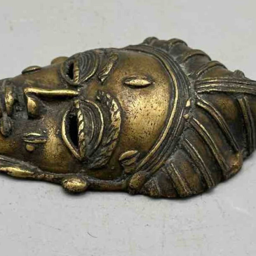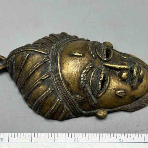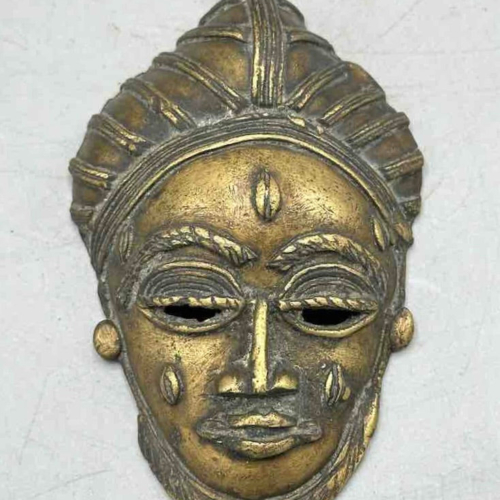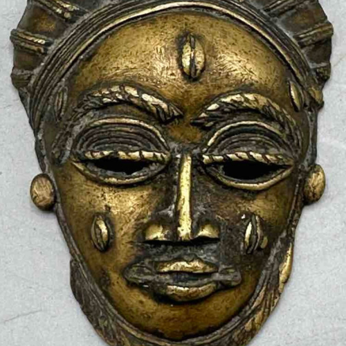 Contemporary African brass mask in the Baule tribal style with a hole on the top, allowing it be hung or worn as a pendant on a necklace. This pendant was made by the ancient traditional lost wax casting process where the object is first shaped of bees wax then covered with a sand & clay investment. This unit is dried and then baked so the investment hardens and the wax runs out leaving the space into which the molten brass is poured. Once cooled the investment is removed, broken off, never able to be used again, to yield the object so cast. Every single object of this type, no matter how small, is made this same way, one by one, by hand. This mask is exceptionally well cast with an unusual degree of detail. This mask measures: 4″ (including loop) x 2 7/16 x 3/4″ (10 x 6 x 2 cm)