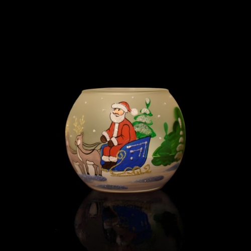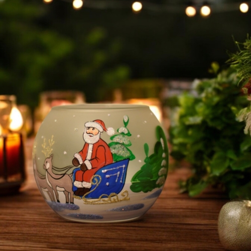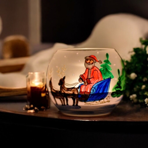 • Handcrafted In L’Viv Oblast, Ukraine• Mouth Blown Glass• Hand Painted – Stencil Free• Wraparound Design Means There’s Always Something To See• Individually Boxed (A Unique Piece Of Glass Art In Every Box)• Large is Approximately 4″ Tall and 4.5″ Wide• Ships From Greensburg, PA• 1 Day Order Processing• A Gift That Will Be CherishedOld world craftsmanship comes to life in these elegant, hand painted, Santa Clause candle holders. These charming mouth blown glass candle holders are a great addition to any home.Set in the countryside, Santa is being pulled by his favorite reindeer. You can really see the brush strokes when the candle is lit and the lights are dimmed. It’s really a beautiful sight!Please note this is currently available in light blue only like you see in the video. The white version is sold out for the year!Each of our blown glass pieces is hand painted with skill, precision and love. While some prefer to use battery operated candles the best results are achieved using a real candle**.These candle holders are designed for tea lights, but depending on the size you get, can accommodate larger sizes as well.Large about 4″ tall and 4.5″ wideMade in Ukraine**Please note the candle holders are hand painted on the outside, so please do not allow them to get wet as water can damage the finish. To remove any wax we suggest a plastic butter-knife or a finger nail to scrape and a napkin or towel to wipe the inside.Materials: Glass,Acrylic Water Colors,Glitter,Glue,Love,Talent,Skill,Precision