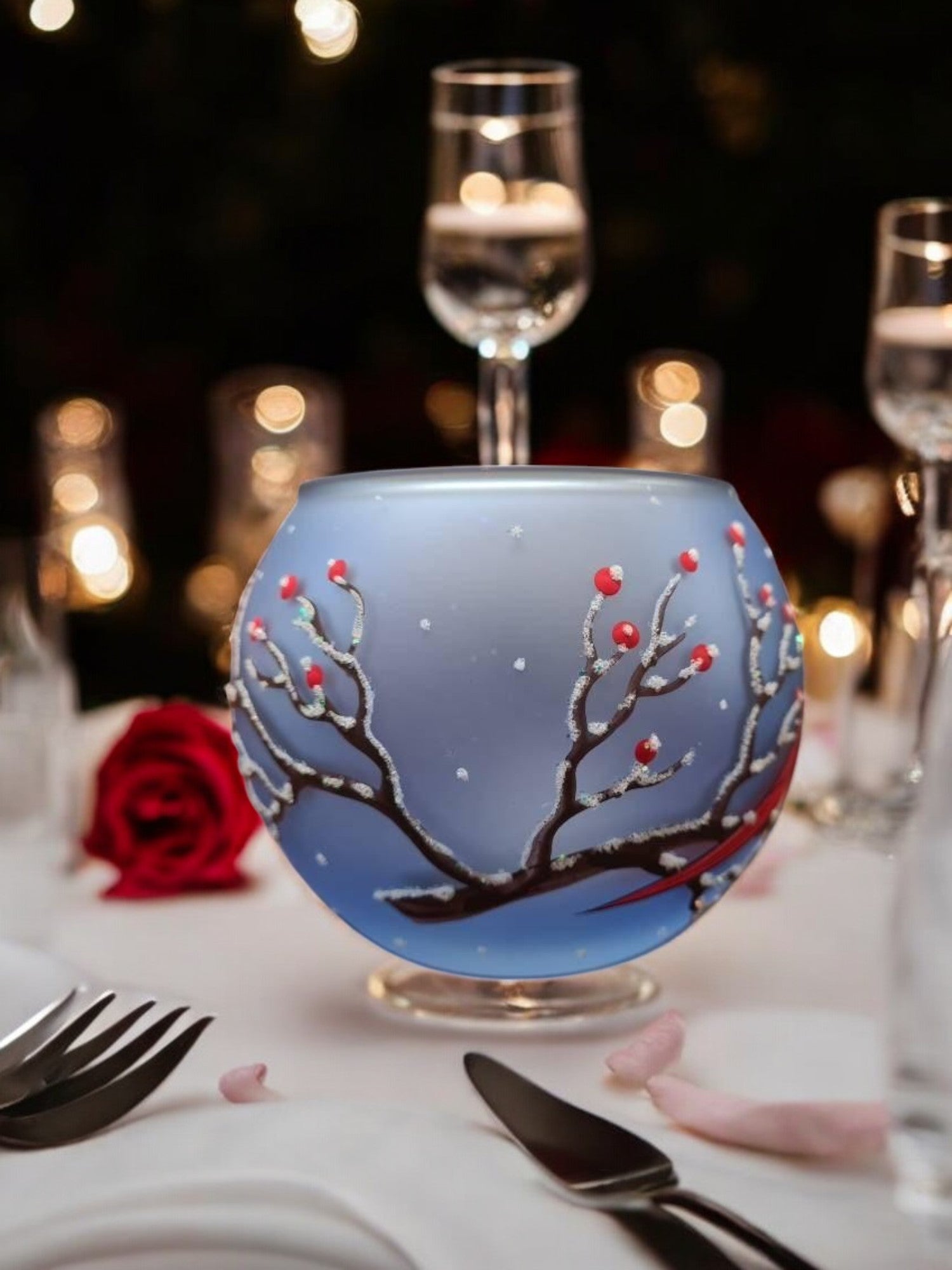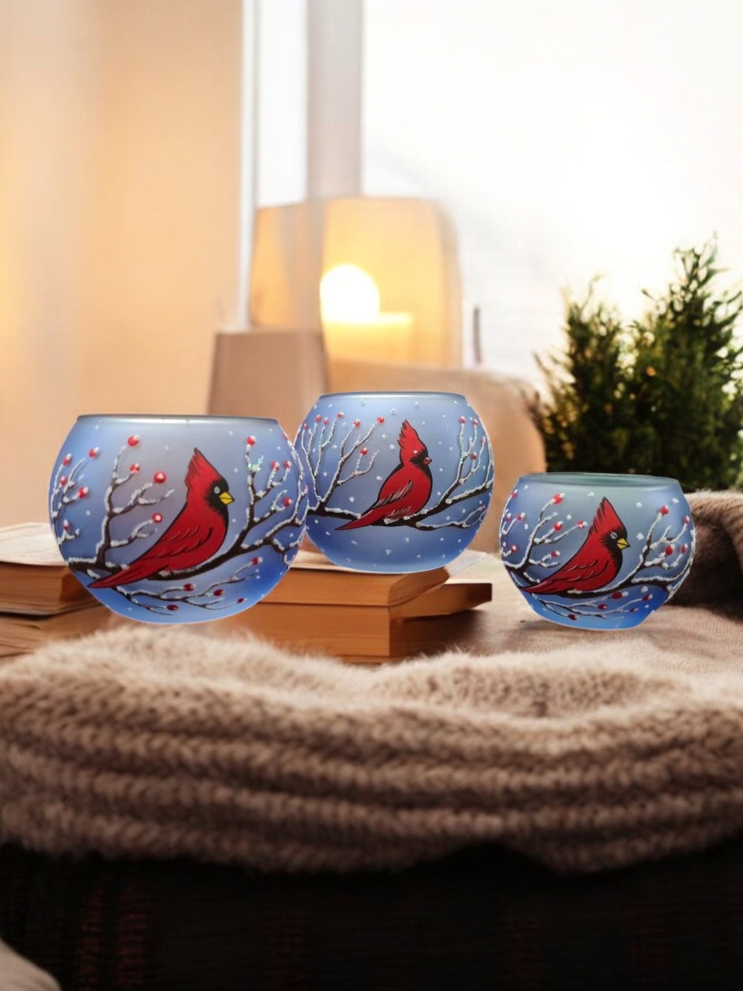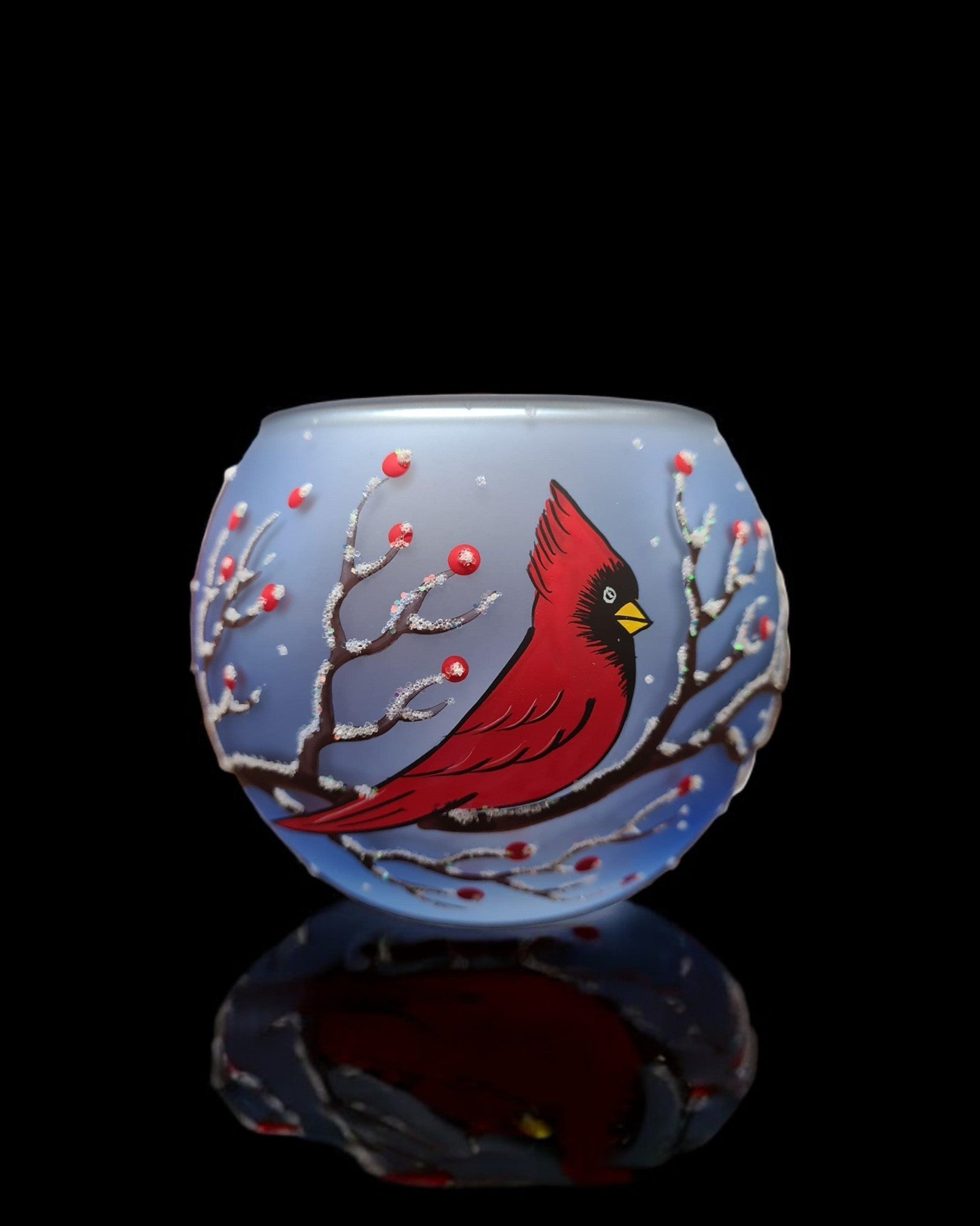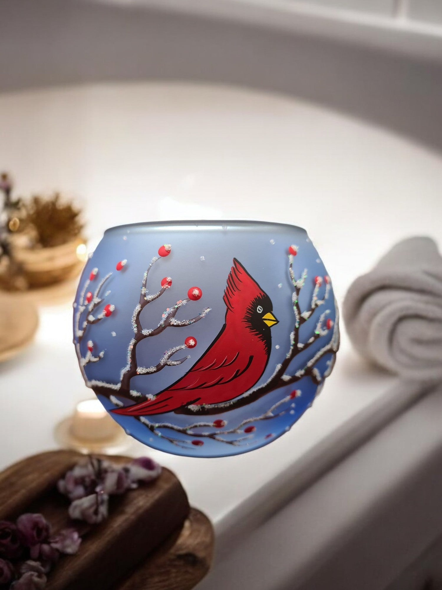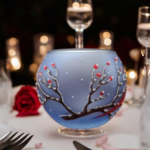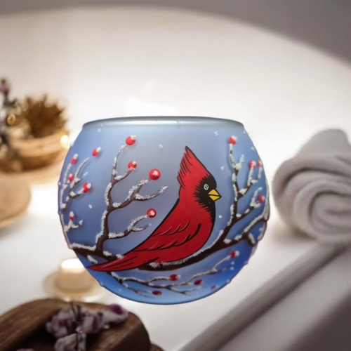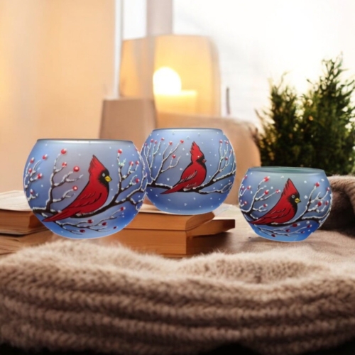 • Handcrafted In L’Viv Oblast, Ukraine• Mouth Blown Glass• Hand Painted – Stencil Free• Wraparound Design Means There’s Always Something To See• Individually Boxed (A Unique Piece Of Glass Art In Every Box)• Large is Approximately 4″ Tall and 4.5″ Wide• Ships From Greensburg, PA• 1 Day Order Processing• A Gift That Will Be CherishedBrighten your space with the enchanting glow of our hand-painted blown glass candle holders. Featuring a intricate red cardinal design, each piece is a testament to exquisite Ukrainian craftsmanship. Perfectly sized for tea lights, this unique holder adds a touch of elegance and artistry to any room. Whether you’re seeking a centerpiece for a cozy evening or a thoughtful gift, this candle holder brings warmth and beauty to your home decor. This candle holder can accommodate 1 tea light. Each piece is hand painted and we take great pride in our attention to details. Makes a wonderful gift, especially for those looking for something unique! Each of our blown glass pieces is hand painted with skill, precision and love. While some prefer to use battery operated candles the best results are achieved using a real candle**. These candle holders are designed to accommodate tea lights. Large about 4″ tall and 4.5″ wideMedium about 3″ tall and 4″ wideSmall about 2″ tall and 2.5″ wide **Please note the candle holders are hand painted on the outside, so please do not allow them to get wet as water can damage the finish. To remove any wax we suggest a plastic butter-knife or a finger nail to scrape and a napkin or towel to wipe the inside. Please be gentle. Perfect for Christmas, Easter, New Years, Birthdays, Anniversaries, Graduations, Valentine’s Day, Mothers Day, or celebrate a House Warming. Embrace the artistry of glass candle holder, a timeless handcrafted gift. Please allow for slight variances as each piece is unique, just like you. Note: The listed price is for a single candle holder Made In Ukraine