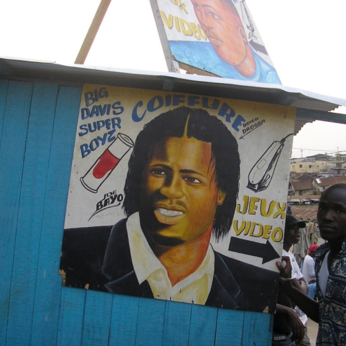 This sign advertised a barbershop offering video games, popular among the youth everywhere. Featured on this sign is the most popular celebrity in Ivory Coast, Didier Drogba, the Ivorian football (soccer) player. 37 1/4 x 39 1/8″ (95 x 99 cm) We are pleased and honored that this sign is being featured in the African Hairdressing and Barbershop Sign show at the SFO Museum at the San Francisco International Airport which runs from February 29 to September 4, 2020. Therefore, it is not available for purchase until October of this year. Please contact us if you would like to reserve this once this exhibition will be over.
