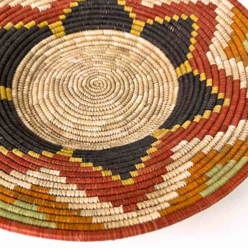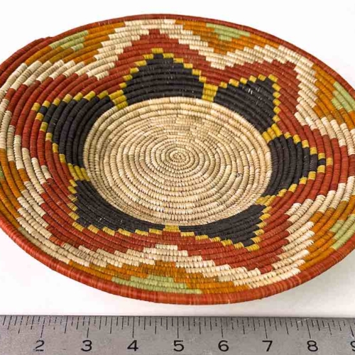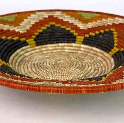 This basket/bowl is one of the thinnest coil and therefore finest quality woven basket in Africa. The design is among the most intricate, demonstrating the very advanced skill of the women who make these in Uganda, near the Ruwenzori Mountains. This one is relatively small which affords the woman who made it to show off her exceptional basket weaving ability at a lower cost. We think these are the most beautiful and finest quality baskets we have ever seen, reflecting the unbelievable ingenuity of these amazing Ugandan artisans. Locally available natural dyes are used to create the vibrant colors which contribute to the beauty of these baskets This basket measures 11″ in diameter x 1 7/8″ deep.