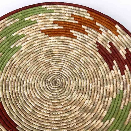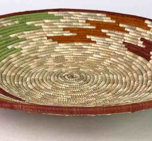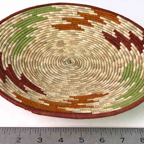 This basket/bowl is one of the thinnest coil and therefore finest quality woven basket in Africa. The design is among the most intricate, demonstrating the very advanced skill of the women who make these in Uganda, near the Ruwenzori Mountains. This one is relatively small which affords the woman who made it to show off her exceptional basket weaving ability at a lower cost. We think these are the most beautiful and finest quality baskets we have ever seen, reflecting the unbelievable ingenuity of these amazing Ugandan artisans. Locally available natural dyes are used to create the vibrant colors which contribute to the beauty of these baskets This basket measures 11 1/8″ in diameter x 1 1/2″ deep.