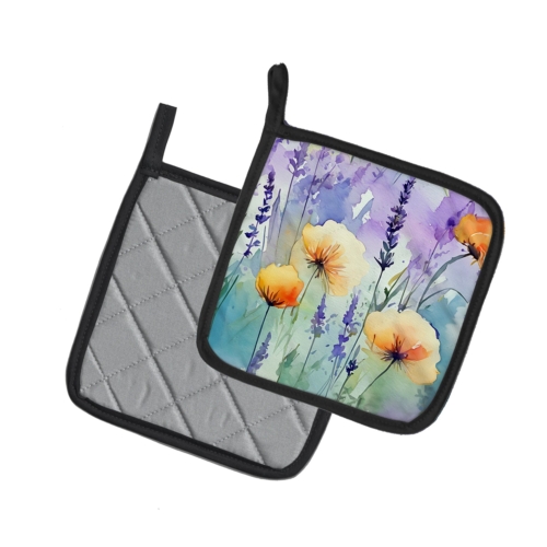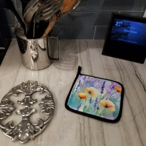 Pair of Pot Holders featuring breed specific Lavender artwork. A Pair of Pot Holders to match your kitchen decor. Made in the USA these are thick and functional. Full color artwork decorates the front polyester fabric of the hot pad and accented by a black trim. Use these at as a trivet for your Thanksgiving or Christmas tablescape. Filled with insulated fabric and quilted for durability. These colorful pot holders will make a great gift for your favorite home cook or executive chef. Each pot holder measures approximately 7 1/2 inches by 7 1/2 inches. A hanging tab is included.