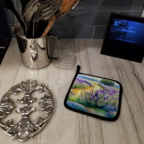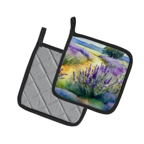 Pair of Pot Holders featuring breed specific Lavender artwork. A Pair of Pot Holders to match your kitchen decor. Made in the USA these are thick and functional. Full color artwork decorates the front polyester fabric of the hot pad and accented by a black trim. Use these at as a trivet for your Thanksgiving or Christmas tablescape. Filled with insulated fabric and quilted for durability. These colorful pot holders will make a great gift for your favorite home cook or executive chef. Each pot holder measures approximately 7 1/2 inches by 7 1/2 inches. A hanging tab is included.
