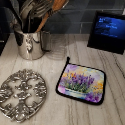 Pair of Pot Holders featuring breed specific Lavender artwork. A Pair of Pot Holders to match your kitchen decor. Made in the USA these are thick and functional. Full color artwork decorates the front polyester fabric of the hot pad and accented by a black trim. Use these at as a trivet for your Thanksgiving or Christmas tablescape. Filled with insulated fabric and quilted for durability. These colorful pot holders will make a great gift for your favorite home cook or executive chef. Each pot holder measures approximately 7 1/2 inches by 7 1/2 inches. A hanging tab is included.