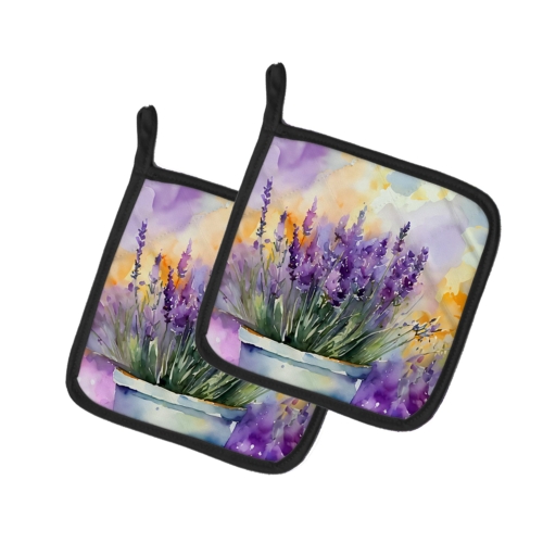 Pair of Pot Holders featuring breed specific Lavender artwork. A Pair of Pot Holders to match your kitchen decor. Made in the USA these are thick and functional. Full color artwork decorates the front polyester fabric of the hot pad and accented by a black trim. Use these at as a trivet for your Thanksgiving or Christmas tablescape. Filled with insulated fabric and quilted for durability. These colorful pot holders will make a great gift for your favorite home cook or executive chef. Each pot holder measures approximately 7 1/2 inches by 7 1/2 inches. A hanging tab is included.