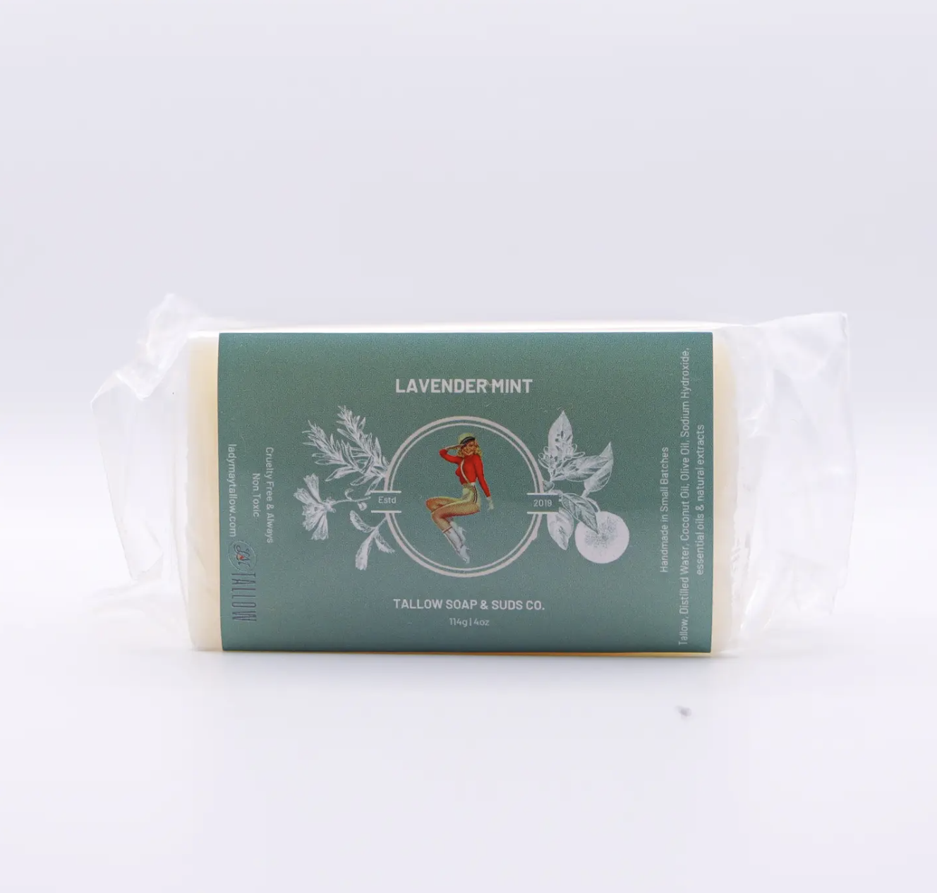 Infused with all-natural ingredients like beef tallow, coconut oil, and pure lavender and mint essential oils, our soap is thoughtfully designed to nurture your skin and simplify your daily care regimen. Every bar is free of synthetics, delivering nothing but the wholesome goodness nature intended.