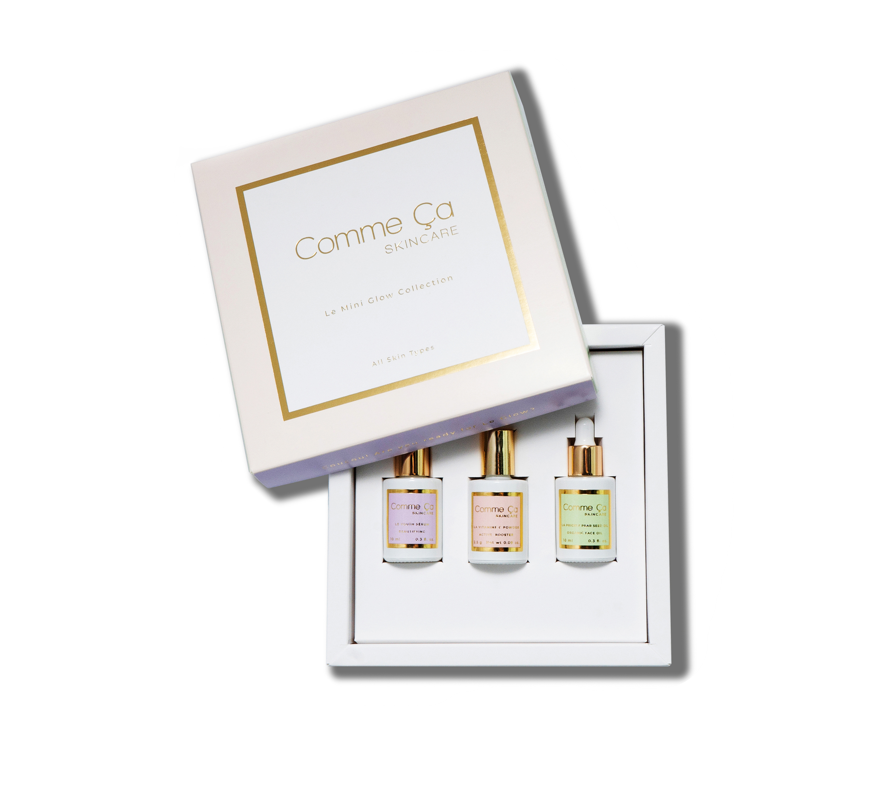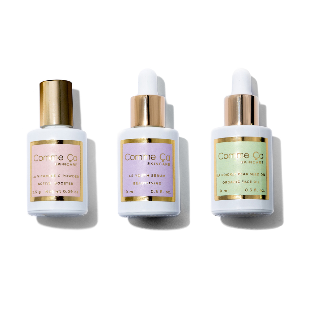 Le Mini Glow Collection consists of the first three products from our skincare collection (La Vitamine C Powder 2,5 g, Le Youth Sérum 10 ml, and La Prickly Pear Seed Oil 10 ml) in travel-friendly sizes. Ideal for holidays or first-time Comme Ça Skincare users who want to try them all out first, this collection is a one-stop-solution to nourish, moisturize, and protect the skin, leaving it with a beautiful, radiant glow. The minis are also available separately from each other.