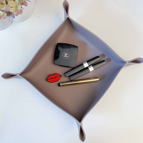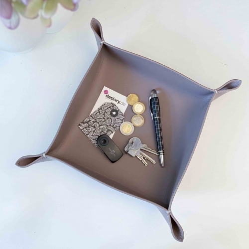 Our pocket emptier looks great as a single decorative tray due to its robust yet soft looking leather. The silver rivets on the corners give the tray stability, so that the items cannot fall out. Whether you use the leather bowl in the entrance area as a key holder or change tray, in the office as a pen tray or in the bathroom as a jewelry tray, the leather bowl gives the room and your objects a modern touch. With the leather bowl you have all possibilities due to the practical dimensions of 20cm x 20cm x 6cm pure storage space. Due to the smooth leather, the leather bowl is dirt-repellent, can be wiped clean with a damp cloth and is easy to clean.