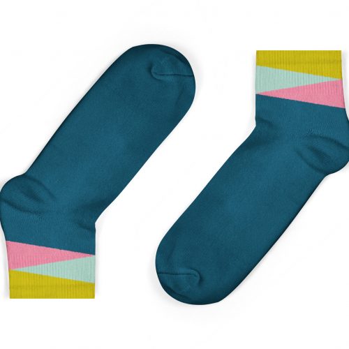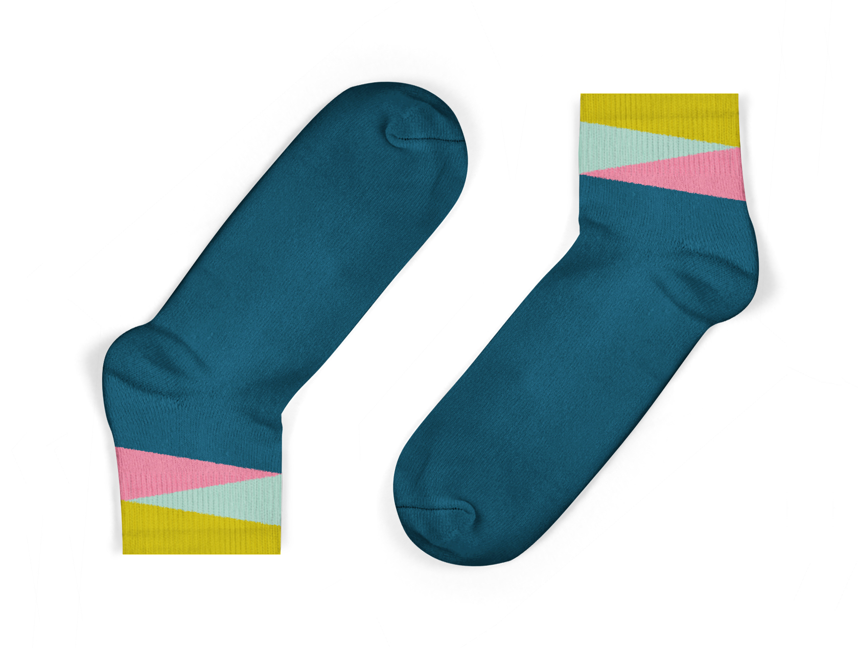 The hardest thing about our geom socks is choosing which colour combination to wear.Made in Portugal from soft organic cotton these legion blue socks feature a bright ribbed cuff with a combination of mustard, fresh mint and pink colours.