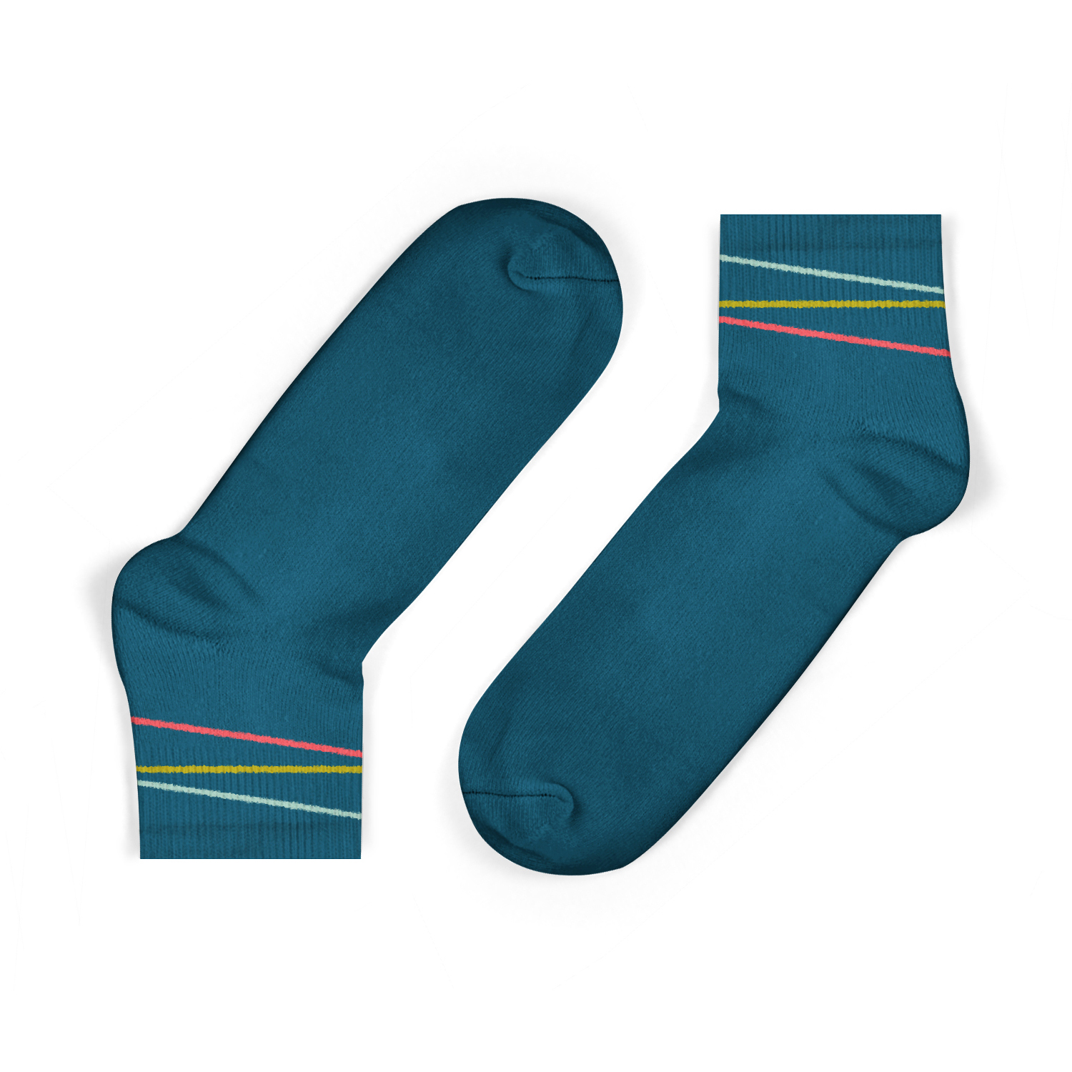 Vibrant colours of our diagonal stripes socks will add fun to any outfit. Made in Portugal from pure organic cotton our unisex socks feature diagonal stripes in mint, mustard and coral on gorgeous legion blue.