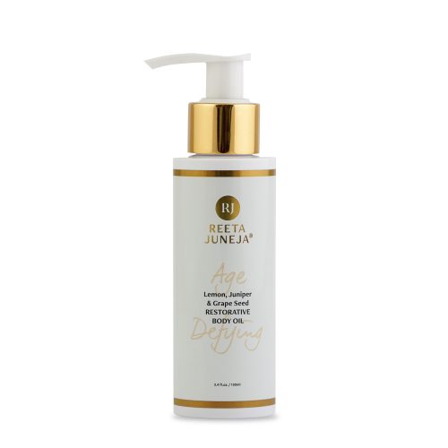 Our restorative body oil has some of most nurturing and potent carrier and essential oils such as Grape Seed, Juniper, Lemon, Rose Geranium and others. Which contains vitamins E, C, and D that helps sealing moisture in your skin which in turn works to alleviate the appearance of ageing, dry and dehydrated skin.