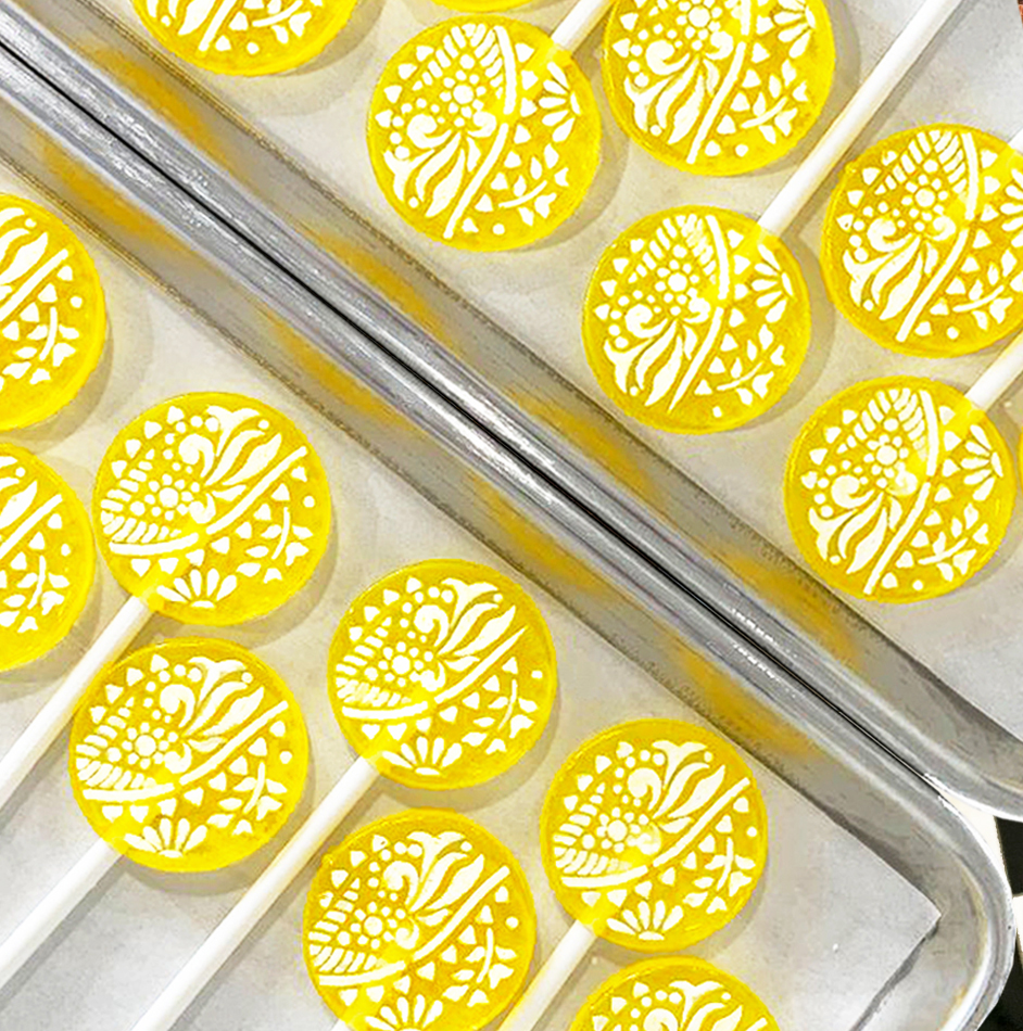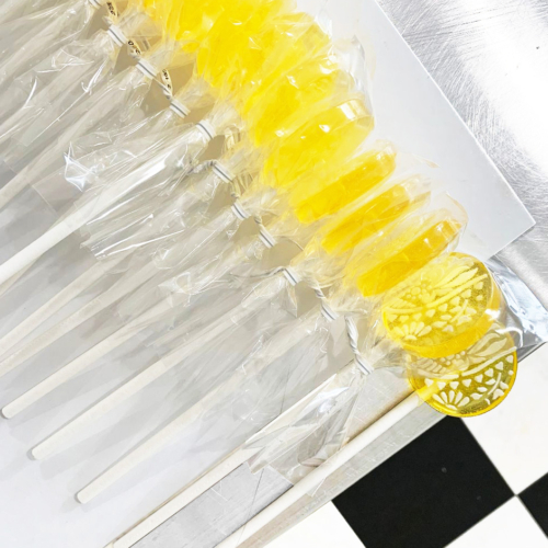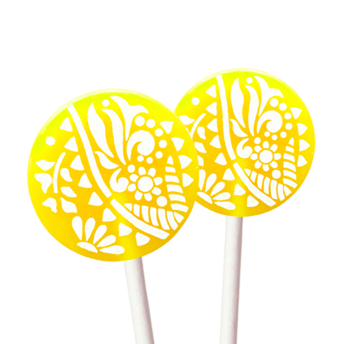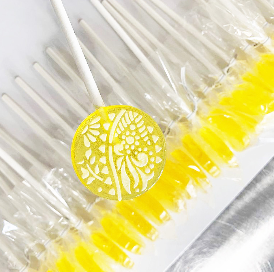Popette of Pendulum’s Lemonade Lollipop Case includes 40 juicy delicious lollipops. Each lollipop has it’s own hand glazed candied vanilla design and measures 2″ in diameter and .375″ (3/8″) thick. Size: 1 oz (27g). Serving Size: 1, 80 Calories. Each Lollipop is individually wrapped.