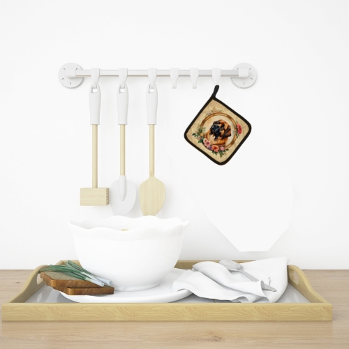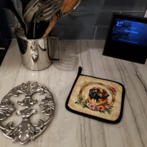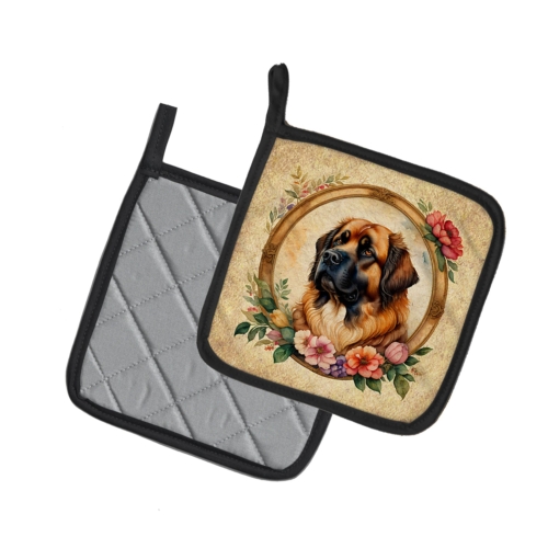 Pair of Pot Holders featuring breed specific Leonberger artwork. A Pair of Pot Holders to match your kitchen decor. Made in the USA these are thick and functional. Full color artwork decorates the front polyester fabric of the hot pad and accented by a black trim. Use these at as a trivet for your Thanksgiving or Christmas tablescape. Filled with insulated fabric and quilted for durability. These colorful pot holders will make a great gift for your favorite home cook or executive chef. Each pot holder measures approximately 7 1/2 inches by 7 1/2 inches. A hanging tab is included.