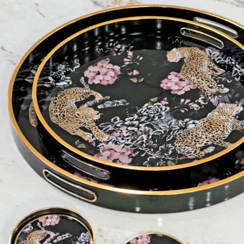 This Leopard Circular Serving Tray is a beautiful and functional piece of serveware. The tray features a unique leopard design with white/ and pink flowers adding a touch of whimsy and color to any home or dining area. Its circular shape allows you to easily serve multiple dishes without taking up too much space. Small Tray Height : 4cmDiameter : 36cm Large Tray Height : 4cmDiameter : 45cm