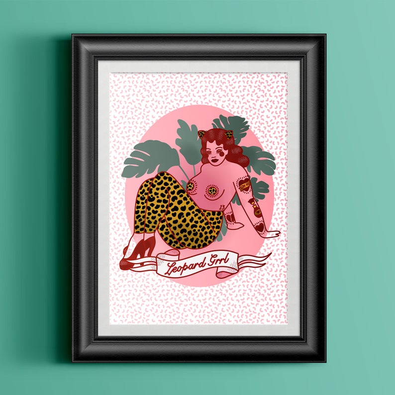 Leopard Girl Pin-up Fine Art Print, A3 / A4 / A5 options (unframed) – Tattoo Flash, Leopard Print, Burlesque, Pink, Vintage Illustration