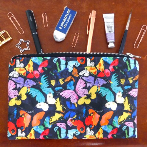 The pure cotton panama outer is digitally printed with one of our designs, before being assembled in the UK with a black, waterproof lining and a silver metal zip. They are packaged with a kraft paper bellyband.