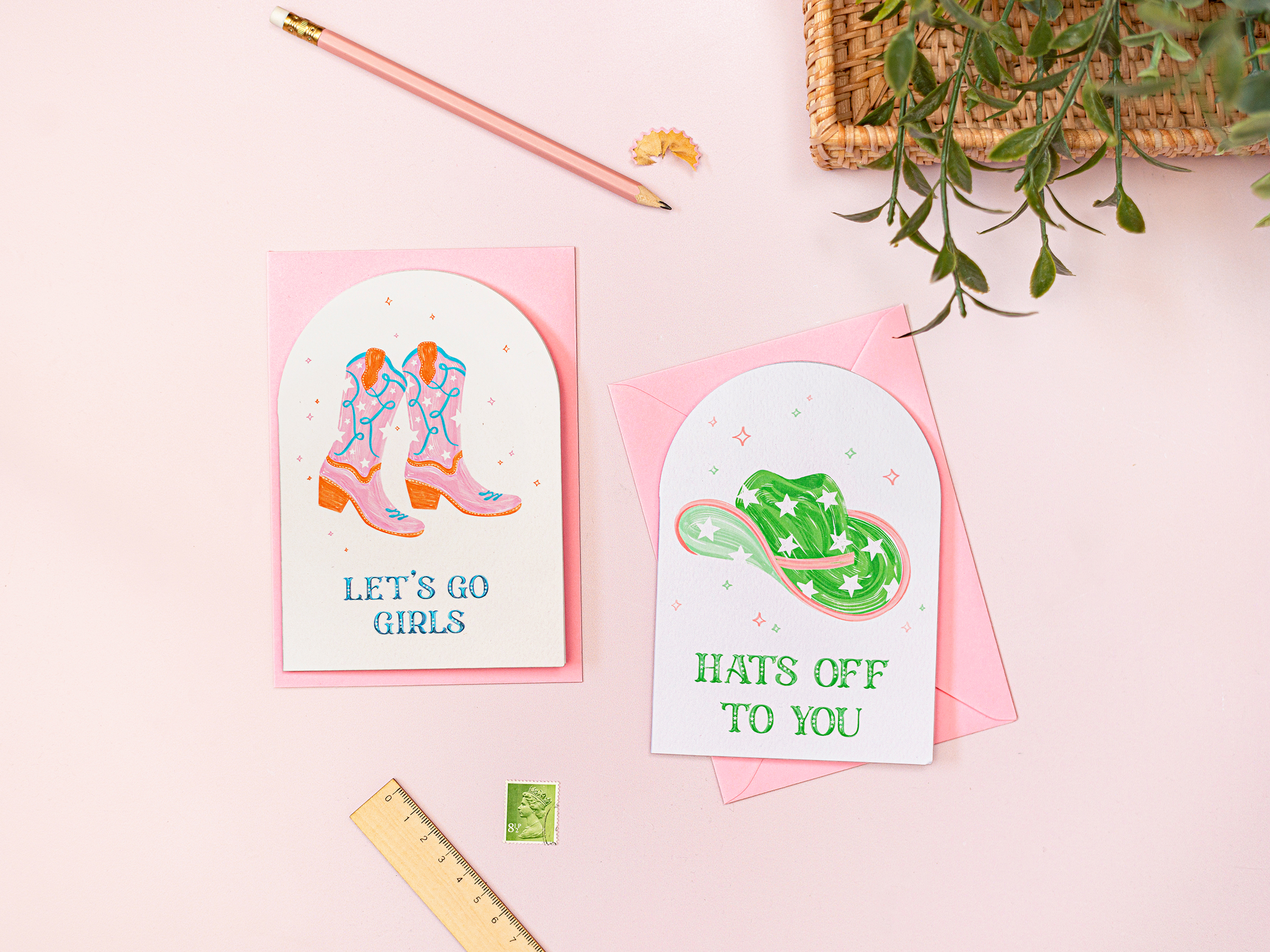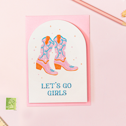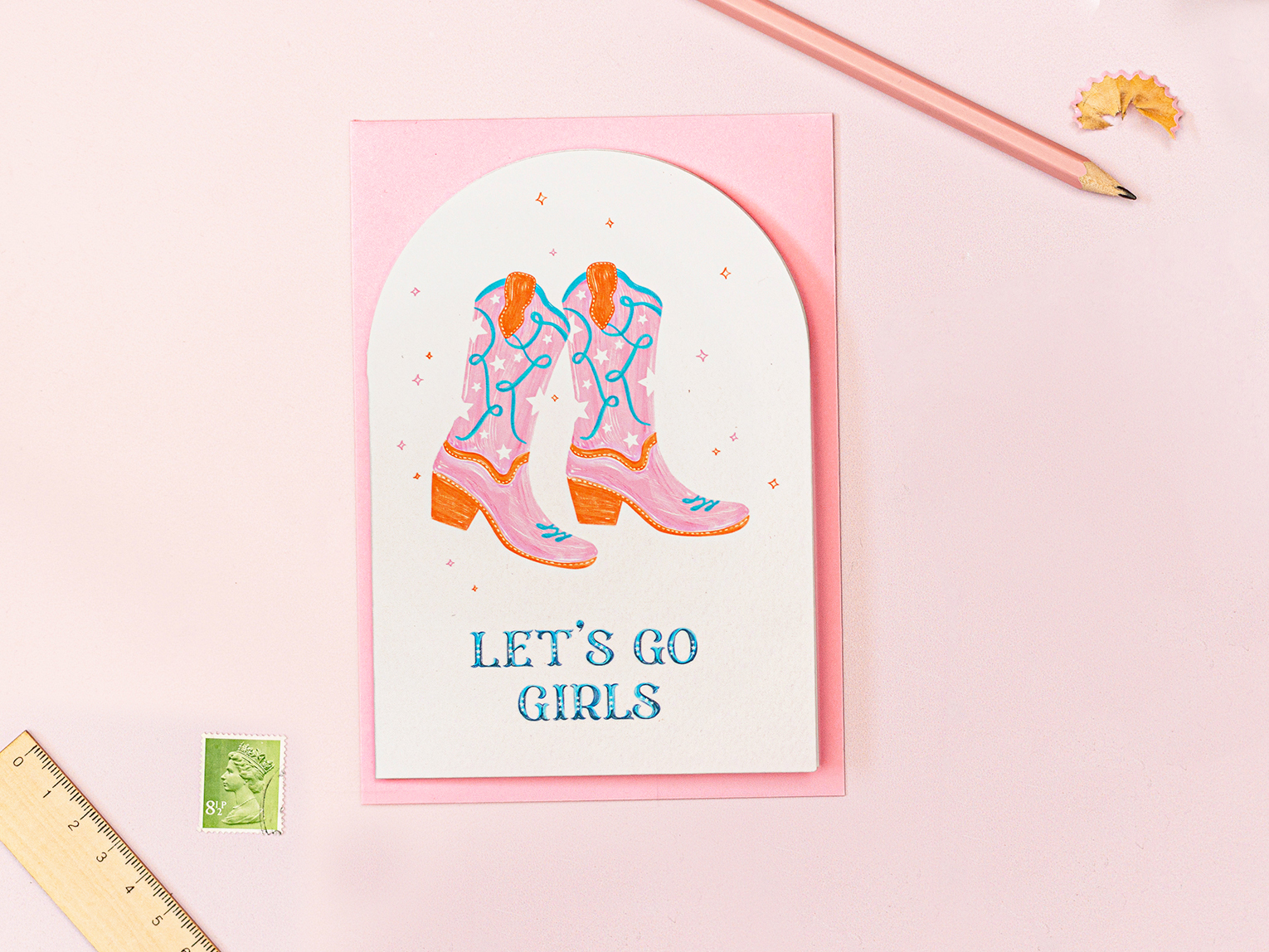 A versatile cowboy inspired greeting card ready for a knee-slapping good time! Use it for birthdays, hens / bachelorettes, pride, and all kinds of light-hearted celebrations.