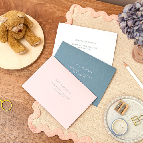 This letterpress A6 baby shower card has that classic, elegant feel that never goes out of style. It carries the sweet message “Happy Baby Shower, Can’t Wait to Meet the New Arrival”.