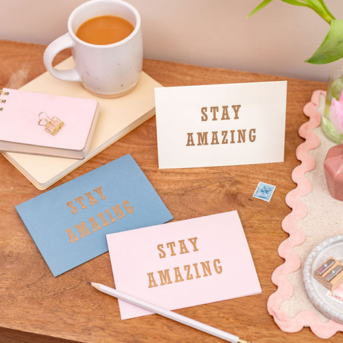 When you want to say how much a person means to you, this Letterpress “stay amazing” on pink card says it all. A straight forward message that says everything your heart wants to express with elegance.