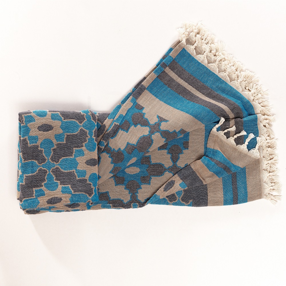 A bold pattern is applied to a taupe and anthracite background. The colour selection combined with its unique tapestry design makes a statement in any room, whether used as a bedspread or a sofa throw.