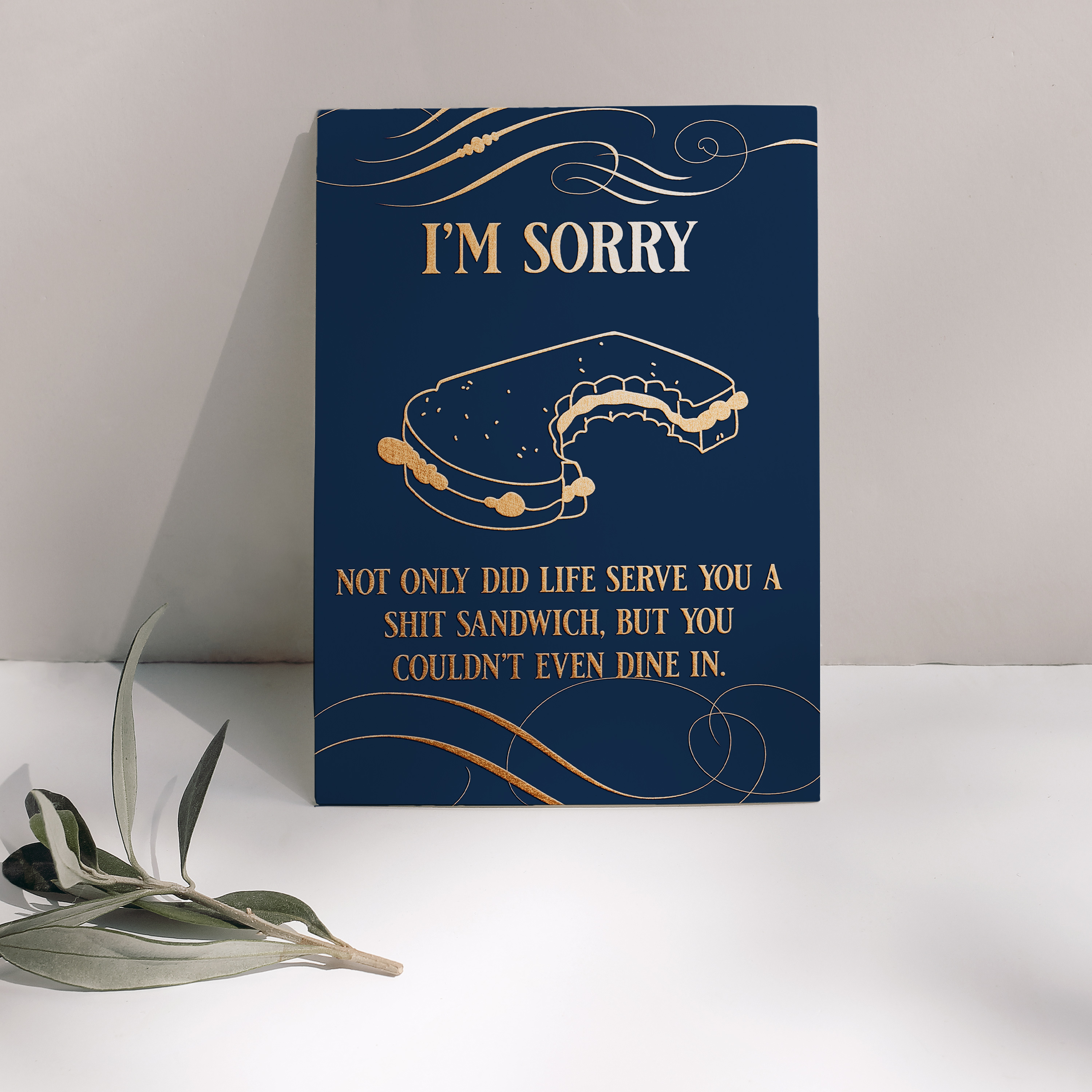 Outside of the card says “I’m sorry, not only did life serve you a shit sandwich, but you couldn’t even dine in.” The inside of the card is blank.