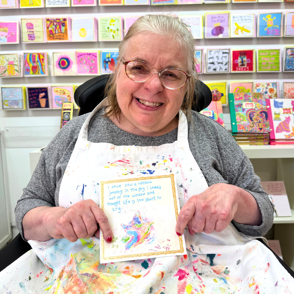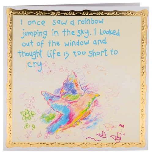 A rainbow in the sky always helps lifts spirits and reminds us that there is beauty all around, just like this beautiful card designed by the talented and compassionate Julianne Clarke. Julianne’s delicate design, incredible use of colour and heartfelt message teaches us to look into the sky and fly high! Printed with a stunning gold frame and blank inside, ready for you to add your own special message.