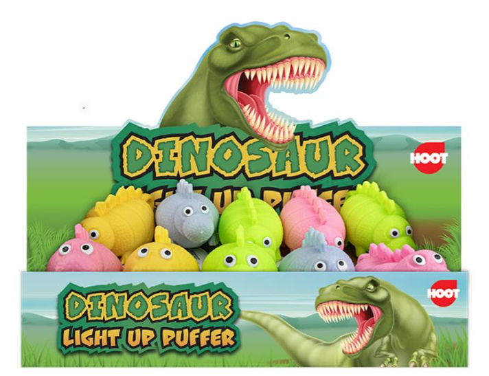 LIGHT UP PUFFY DINOSAURLight up dinosaurs in four assorted colours. Each measures 6 x 11.5 x 5.5cm. The ideal sensory toy.Each puffy dinosaur operates with three 3x non-replaceable button cell batteries, each securely encased within a tight ball.Product Dimensions:6 x 11.5 x 5.5