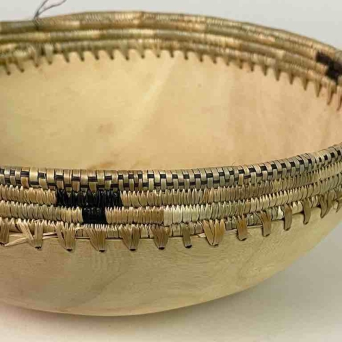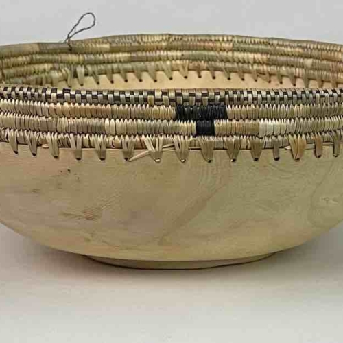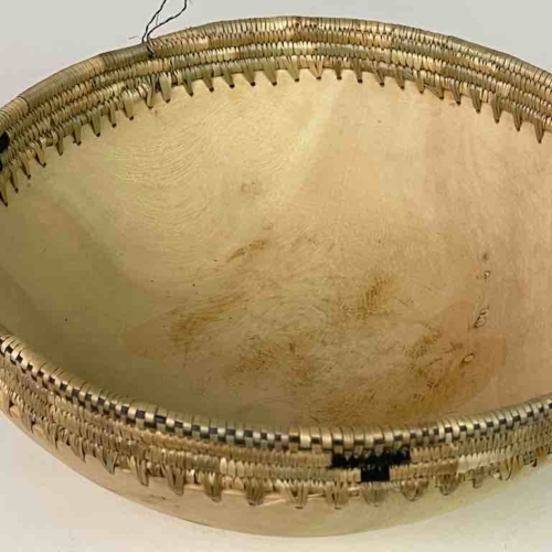 This hand-made wooden bowl is extraordinary in its design being adorned with a hand-woven basketry rim making it “half bowl/half basket”. The name given to these functional art objects in Rwanda by the Tutsi people who make and use them is “Imbehe” – pronounced Eem Bay Hay. This one features a natural light wood bowl with a wide natural basketry rim with black accents. 9 3/4″ in diameter x 4″ deep