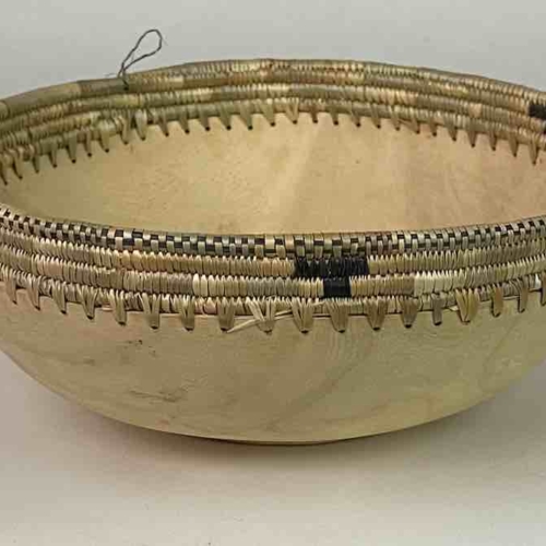 This hand-made wooden bowl is extraordinary in its design being adorned with a hand-woven basketry rim making it “half bowl/half basket”. The name given to these functional art objects in Rwanda by the Tutsi people who make and use them is “Imbehe” – pronounced Eem Bay Hay. This one features a natural light wood bowl with a wide natural basketry rim with black accents. 9 3/4″ in diameter x 4″ deep