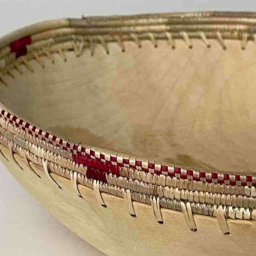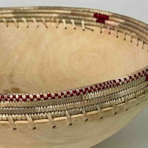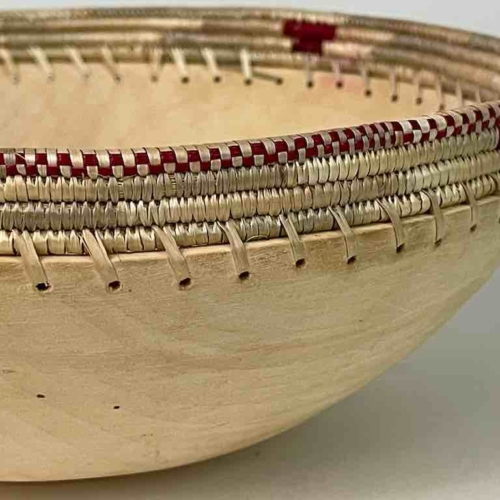 This hand-made wooden bowl is extraordinary in its design being adorned with a hand-woven basketry rim making it “half bowl/half basket”. The name given to these functional art objects in Rwanda by the Tutsi people who make and use them is “Imbehe” – pronounced Eem Bay Hay. This one features a natural light wood bowl with a wide basketry rim with red accents. 10″ in diameter x 3 3/4″ deep