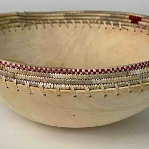 This hand-made wooden bowl is extraordinary in its design being adorned with a hand-woven basketry rim making it “half bowl/half basket”. The name given to these functional art objects in Rwanda by the Tutsi people who make and use them is “Imbehe” – pronounced Eem Bay Hay. This one features a natural light wood bowl with a wide basketry rim with red accents. 10″ in diameter x 3 3/4″ deep