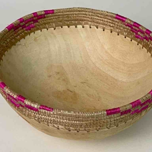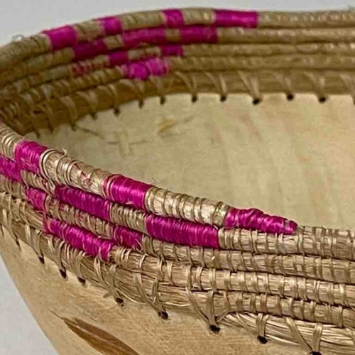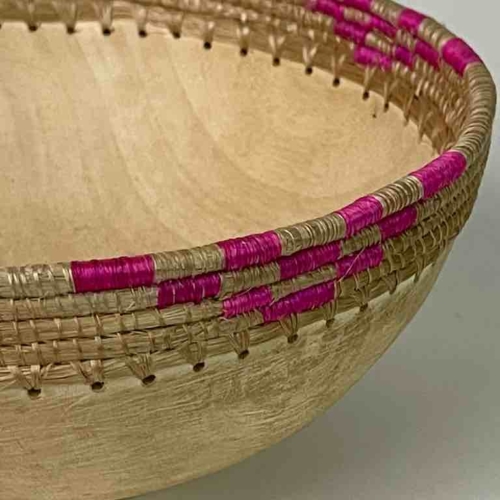 This hand-made wooden bowl is extraordinary in its design being adorned with a hand-woven basketry rim making it “half bowl/half basket”. The name given to these functional art objects in Rwanda by the Tutsi people who make and use them is “Imbehe” – pronounced Eem Bay Hay. This one features a natural light wood bowl with a wide natural basketry rim with fuchsia accents. 7 1/2″ in diameter x 3″ deep