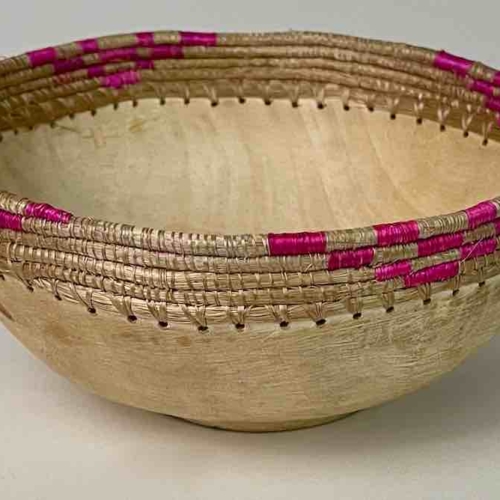 This hand-made wooden bowl is extraordinary in its design being adorned with a hand-woven basketry rim making it “half bowl/half basket”. The name given to these functional art objects in Rwanda by the Tutsi people who make and use them is “Imbehe” – pronounced Eem Bay Hay. This one features a natural light wood bowl with a wide natural basketry rim with fuchsia accents. 7 1/2″ in diameter x 3″ deep