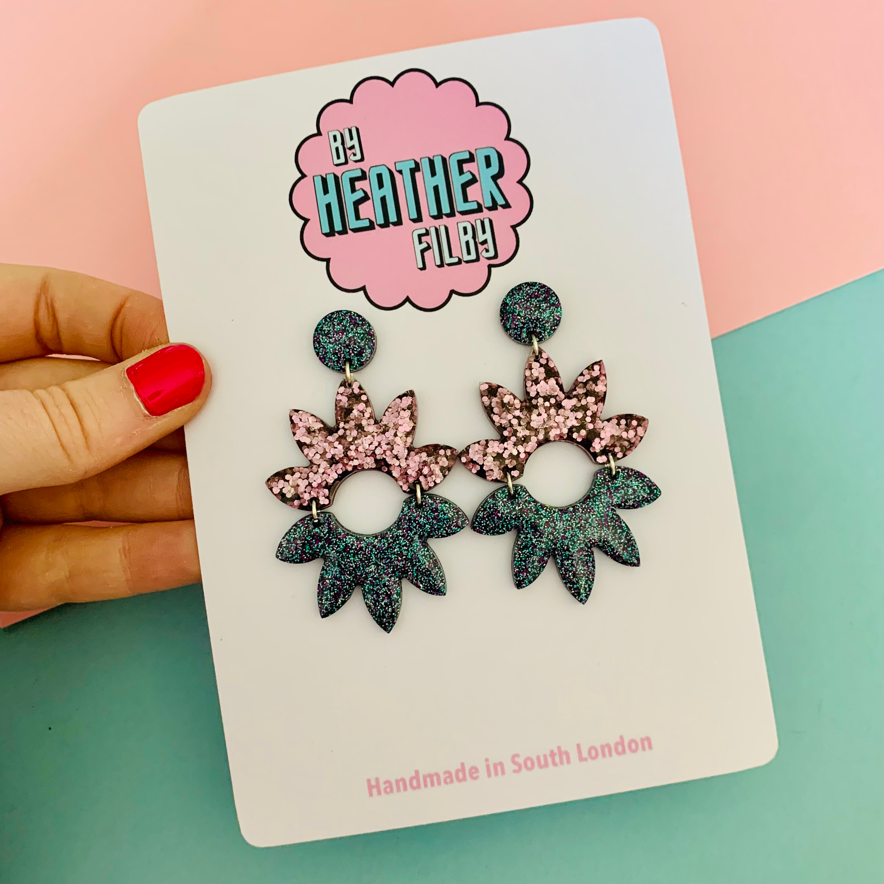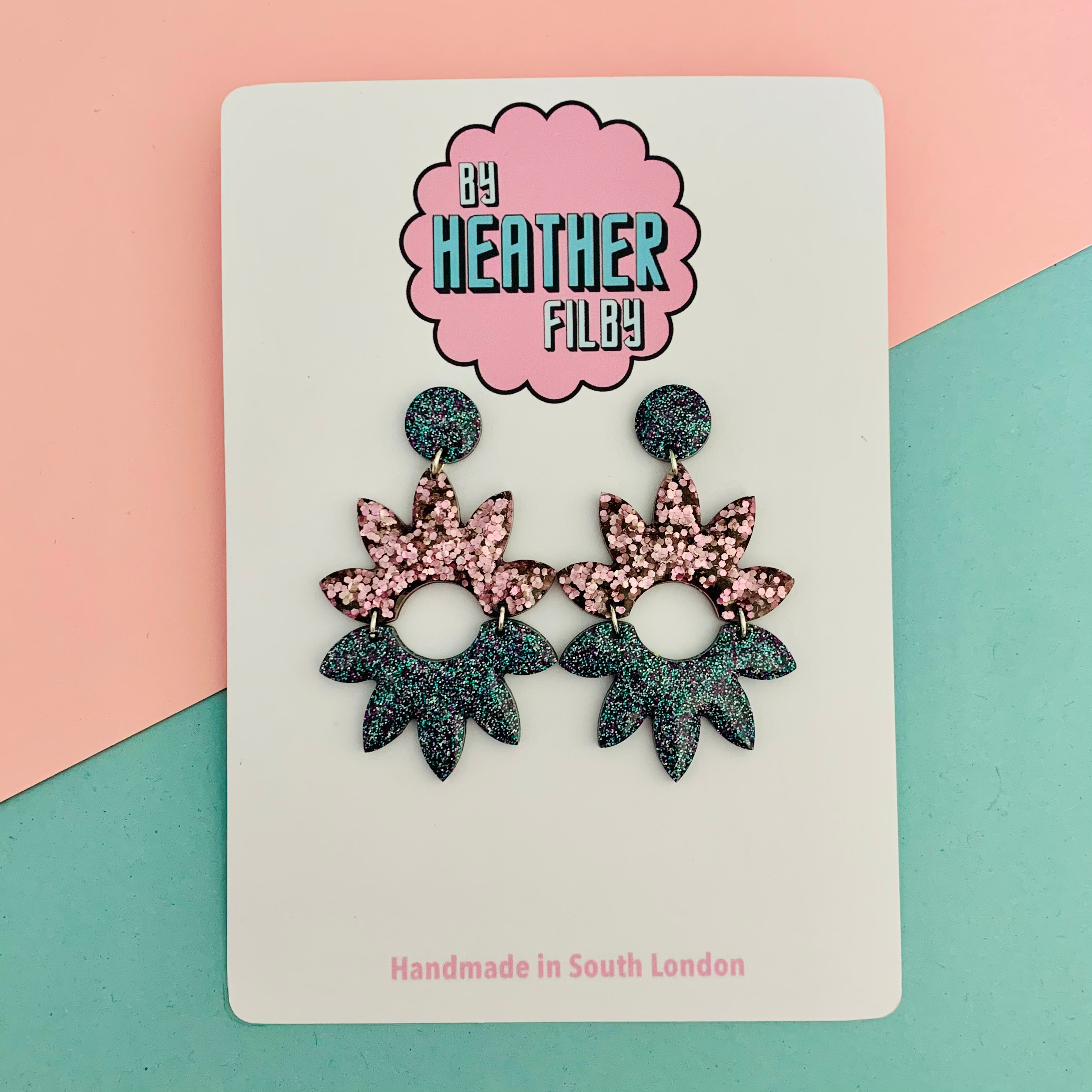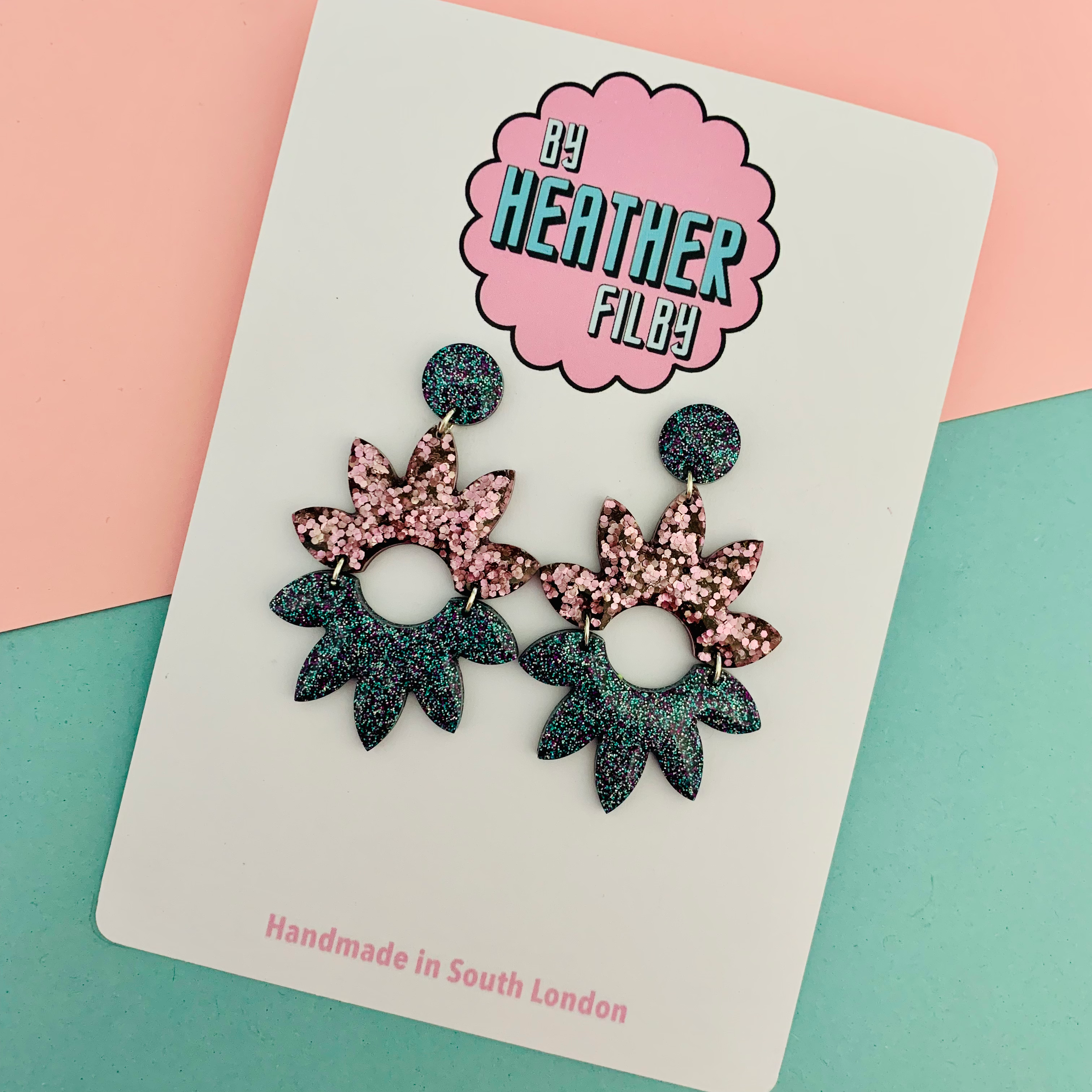 An array of colour & sparkle make unique pieces of statement art for your ears. Notes:- Dimensions: 6cm x 4cm – Please note that as our jewellery is handmade, each piece is individual and tiny imperfections may occur, adding to the charm!- Cute, lightweight and super sparkly- Findings are all silver plated so it keeps the price down for you while still keeping each piece of jewellery great in quality. Follow ‘By Heather Filby’ on social media to see behind the scenes, new products and our design process