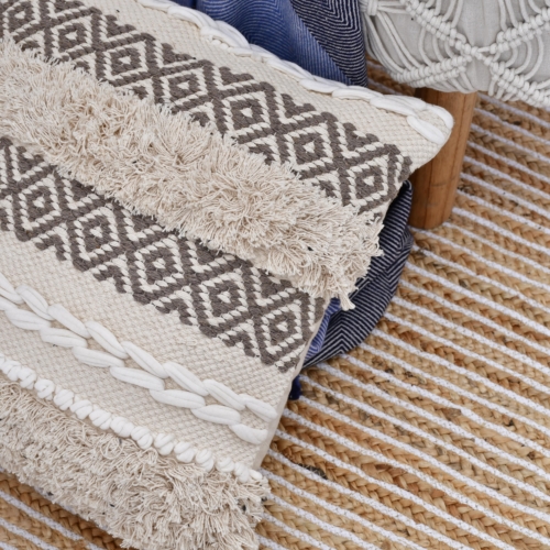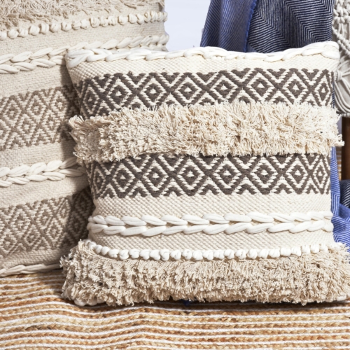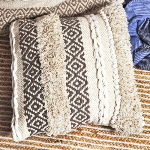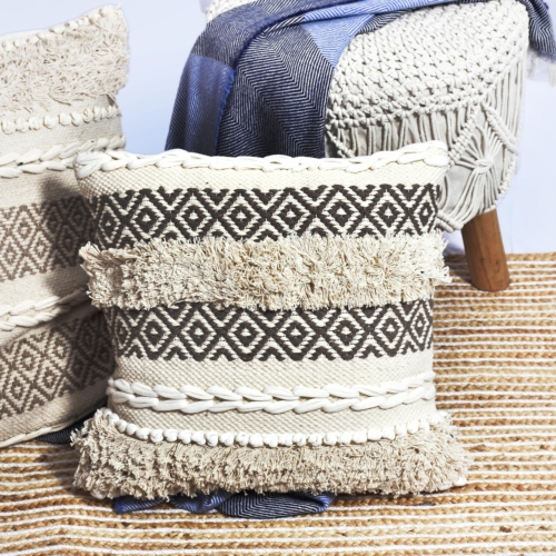 Introducing our beautifully handcrafted cushions, each one meticulously woven by skilled artisans using the finest organic materials. The intricate detailing and unique combination of different craft techniques make each cushion a one-of-a-kind piece. The soft fabric and tassel details add a touch of elegance and comfort to any living space. Each cushion is a testament to the artistry and creativity of our skilled weavers, and the use of organic materials ensures a sustainable and eco-friendly choice for your home decor. Add a touch of warmth and beauty to your living space with these handloom cushions.