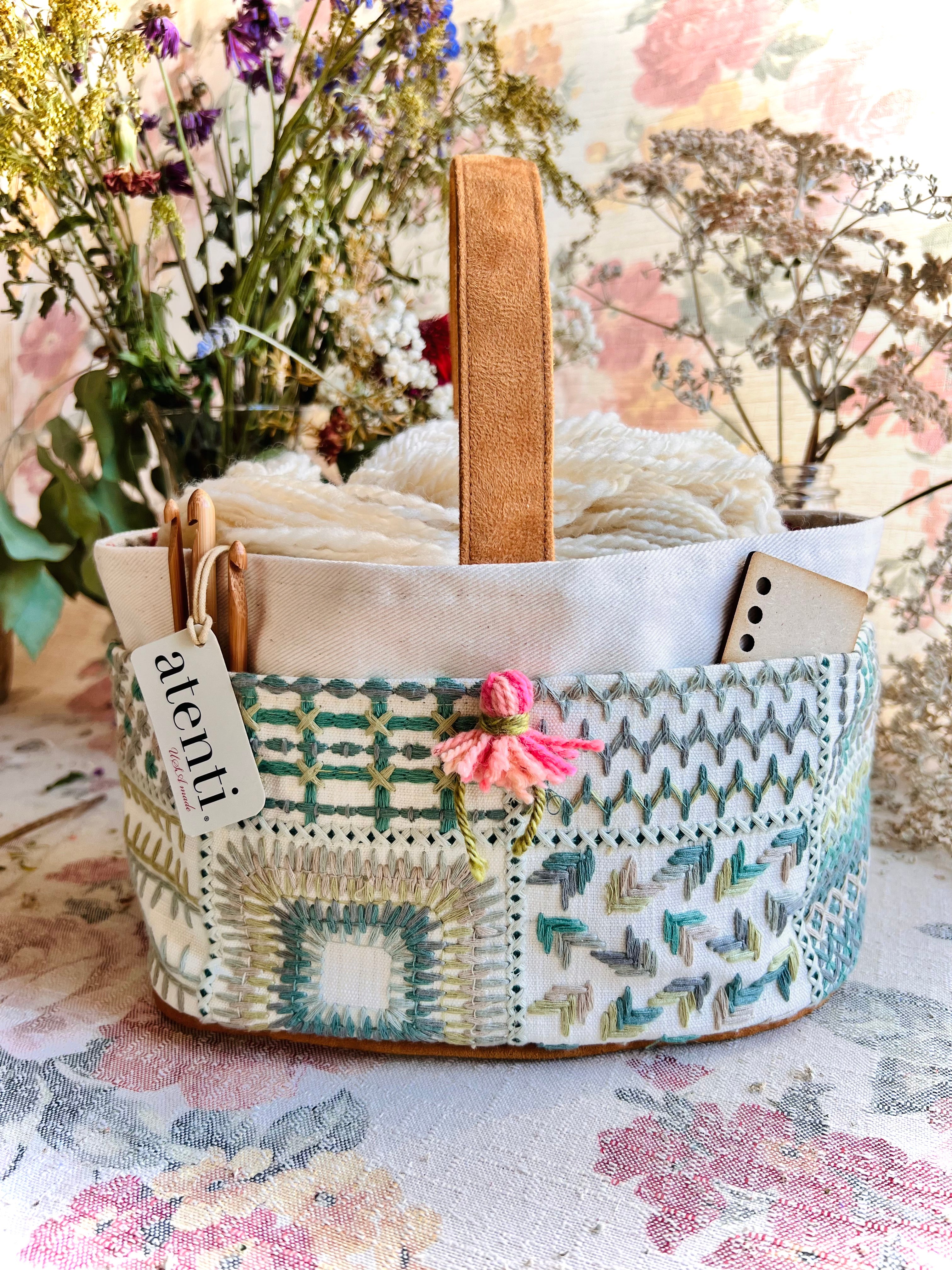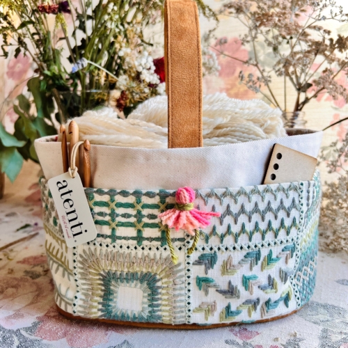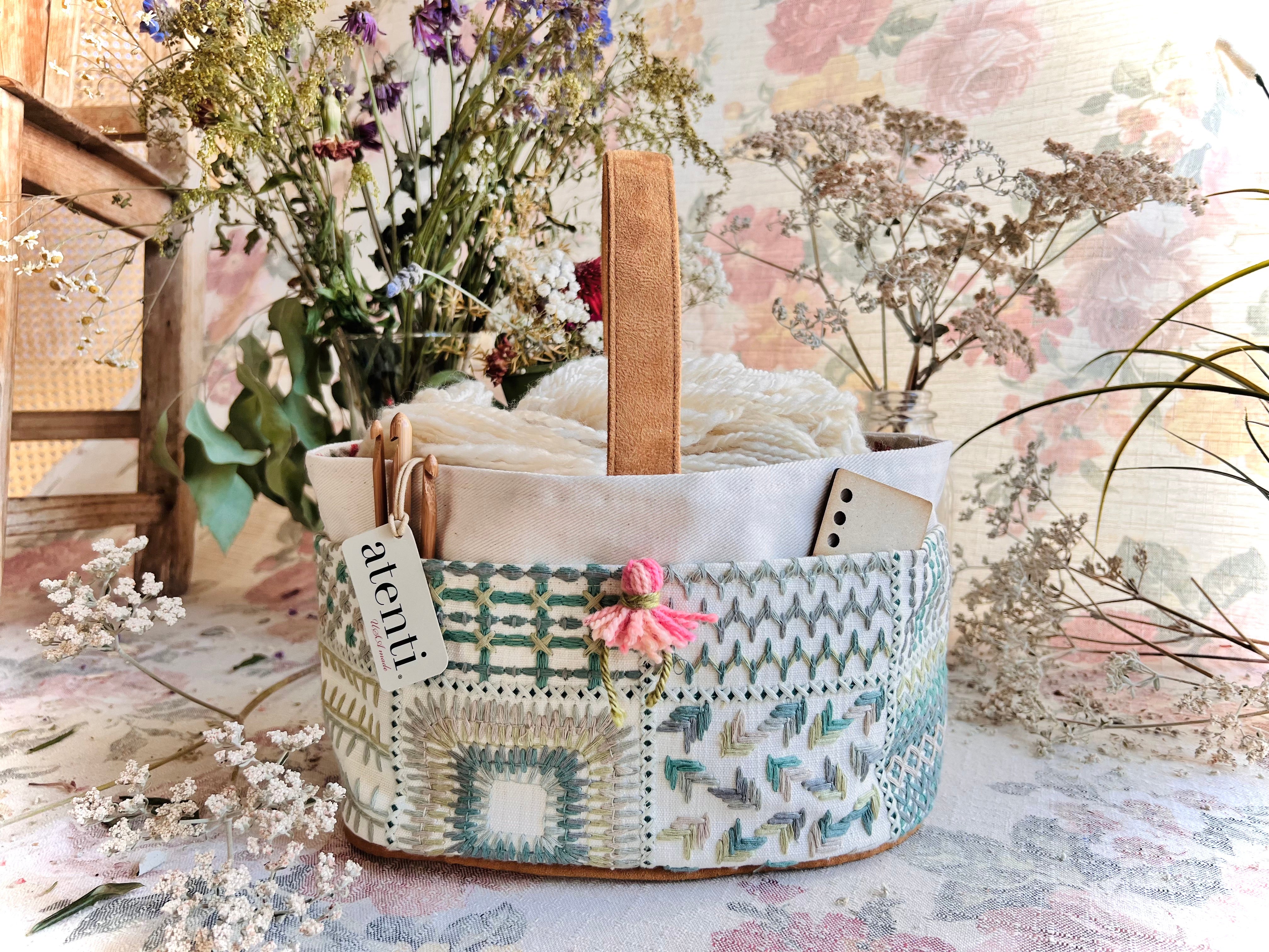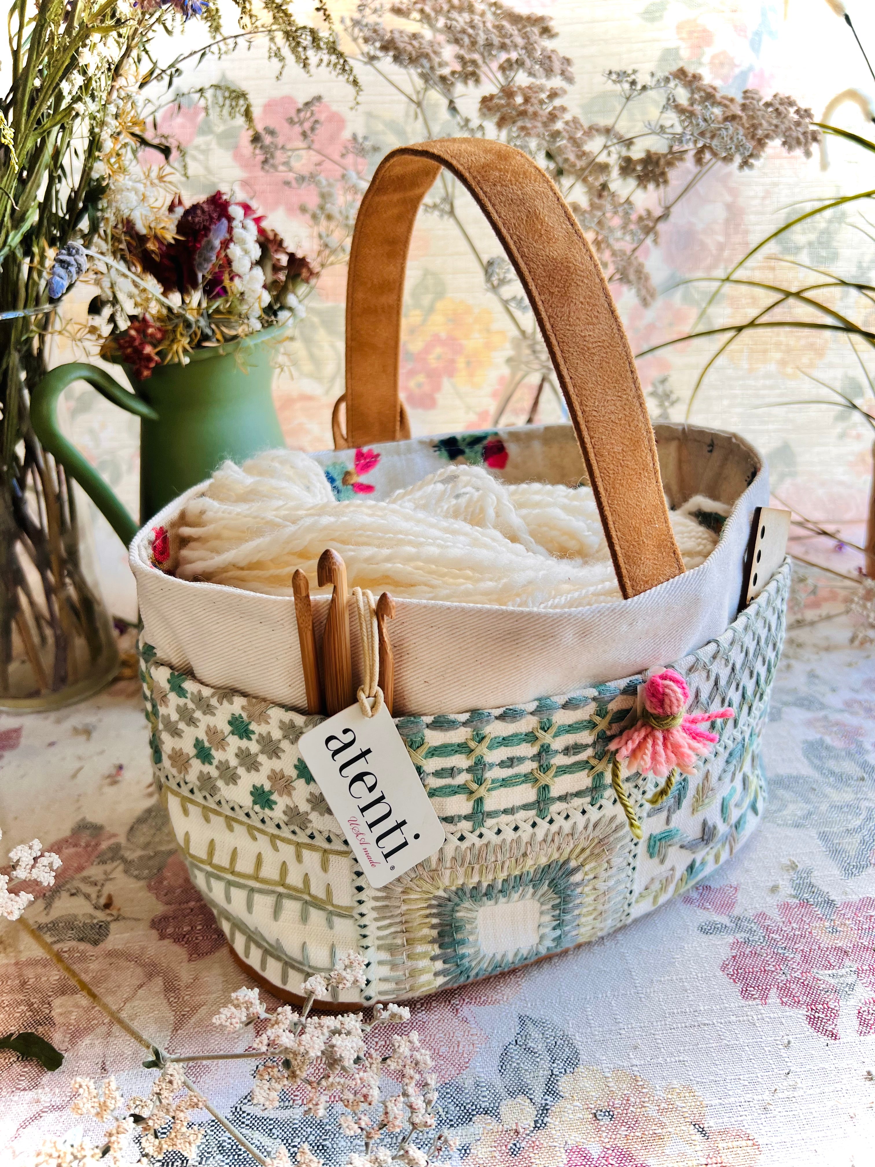 Embroidered in a Granny Square pattern on a heavy duck canvas. This stand-alone, carry around organizer is perfect to store and keep handy all your tools and notions. Itβs fully lined and has four outside and four inside pockets with an ample center well and an ultra suede handle. Show off your retro flair and make a statement with Lily Caddy! MSRP: Wholesale price times 2.2 (minimum) Dimension: 13.00″W x 7.00″H x 7.00″D