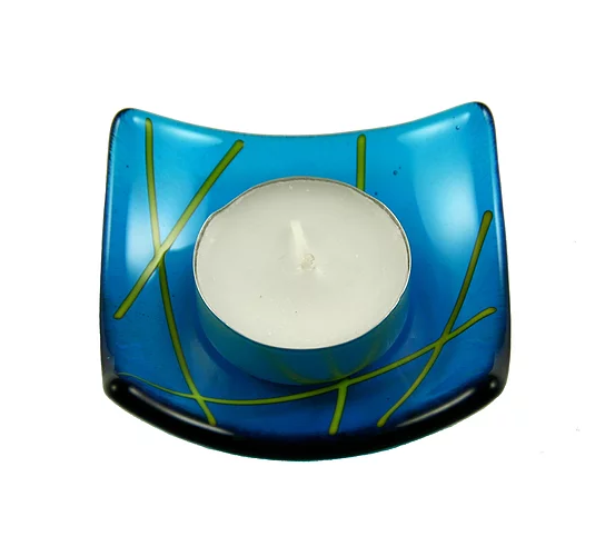 These fused glass candle holders are produced from bright blue glass and feature a lined design in yellow. Each holder measures approximately 8.5cm x 8.5cm x 3cm and comes with a tea light included so that it is ready to display and use. These holders would also be perfect for jewellery and other small items. Please note that as the candle holders are handmade, there may be slight differences in size, colour and design.