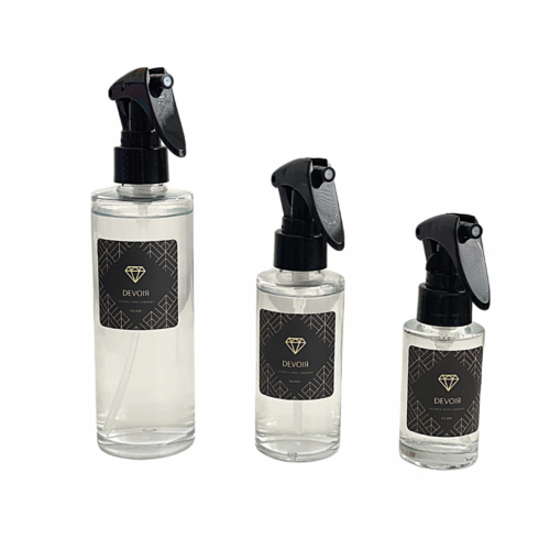 Our Room & Linen sprays come in a Clear Glass Simplicity Bottle & Atomiser Spray, that comes in a choice of 3 sizes 200ml, 100ml and 50ml it is a fabulous product, and the bottle and trigger spray cap combination – it’s both small and simple.