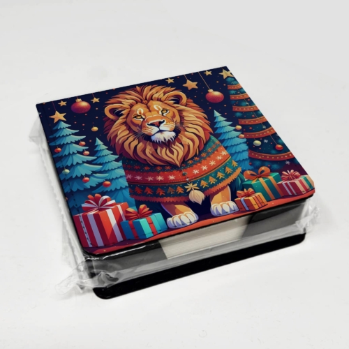 PU Leather Note Paper Holder featuring breed specific Lion artwork. Celebrate Christmas with this Christmas Note Paper Holder. Elevate your workspace with this PU Leather Note Paper Holder, crafted to resemble luxurious leather without the use of animal products. Made from durable synthetic PU leather, it offers both a premium look and eco-friendly appeal. This note holder, compactly sized at 4.25 x 4.25 x 1.25 inches, includes about 160 sheets of 3.75 x 3.75-inch note paper—ideal for quick notes and reminders. An exclusive artist-designed cover makes each holder uniquely vibrant, adding a splash of color and personality to any desk or office. The discrete design keeps note paper hidden, maintaining a neat and organized workspace. Perfect as a gift or for personal use, this stylish holder is refillable with standard paper, ensuring long-lasting utility. A must-have for anyone seeking a sophisticated, artful touch to their workspace while supporting animal-friendly products. Add style, organization, and creativity to your everyday routine with this elegant note paper holder.