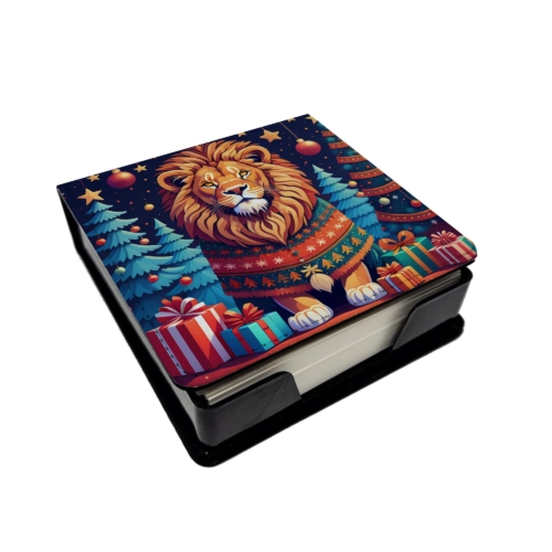 PU Leather Note Paper Holder featuring breed specific Lion artwork. Celebrate Christmas with this Christmas Note Paper Holder. Elevate your workspace with this PU Leather Note Paper Holder, crafted to resemble luxurious leather without the use of animal products. Made from durable synthetic PU leather, it offers both a premium look and eco-friendly appeal. This note holder, compactly sized at 4.25 x 4.25 x 1.25 inches, includes about 160 sheets of 3.75 x 3.75-inch note paper—ideal for quick notes and reminders. An exclusive artist-designed cover makes each holder uniquely vibrant, adding a splash of color and personality to any desk or office. The discrete design keeps note paper hidden, maintaining a neat and organized workspace. Perfect as a gift or for personal use, this stylish holder is refillable with standard paper, ensuring long-lasting utility. A must-have for anyone seeking a sophisticated, artful touch to their workspace while supporting animal-friendly products. Add style, organization, and creativity to your everyday routine with this elegant note paper holder.