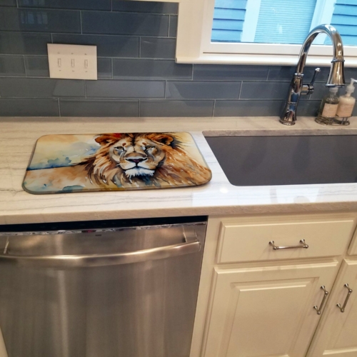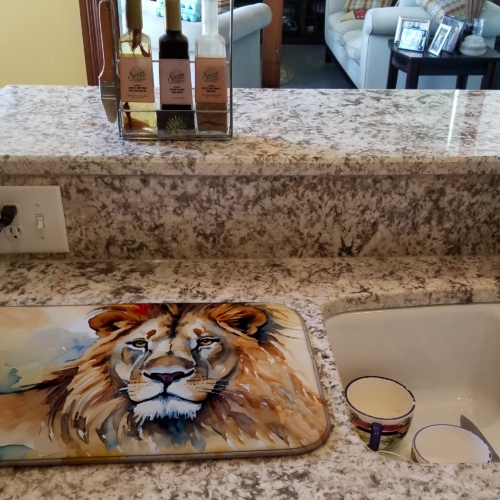 Dish Drying Mat featuring breed specific Lion artwork. Say goodbye to messy countertops and soggy dish towels with our innovative dish drying mat. Our high-quality dish drying pad is designed to keep your countertops dry while offering a stylish and efficient solution. Whether you’re air drying dishes, glasses, stemware, silverware, pots, pans, bottles, or even fruits and vegetables, our dish mat is the perfect choice. The 14 inches x 22 inches size fits most counters and dish drying racks, and the non-slip design ensures stability. Made with water-absorbent polyester and a polyurethane foam insert, our dish drying mat is not only functional but also durable. It’s machine washable and printed in the USA for long-lasting use. The beautiful artwork adds flair to your kitchen decor, making it a perfect housewarming gift or present for any occasion. Upgrade your kitchen experience with our absorbent and versatile dish drying mat.
