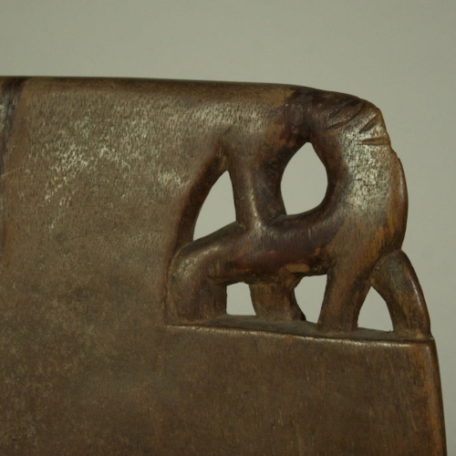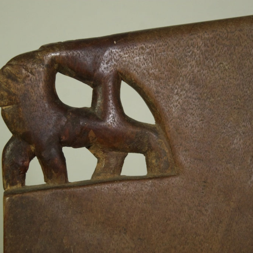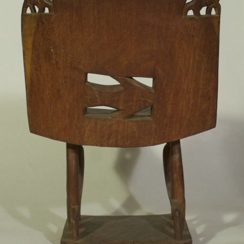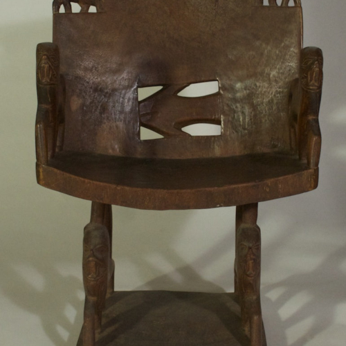 This chair measures 29″ tall (74 cm) x 20″ wide (51 cm) x 14 3/4″ seat height (37.5 cm) x 12 1/4″ seat depth (31 cm). All 4 lions represented on this chair are the symbol of a former ahosu (king) of the Fon people, Glele. Rare, if not unique in Africa, the Fon have a strong sense of their royal heritage, not unlike the British. They know their royal lineage. Each king has his own exclusive symbol, immediately identifiable to all Fon people. Glele was the ahosu from 1858 to 1889.