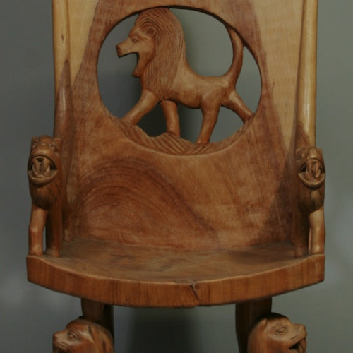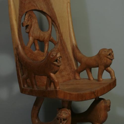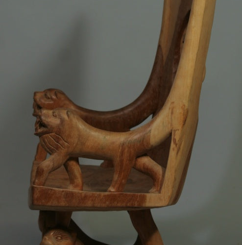 51 1/4″ tall (130 cm) x 21″ wide (53 cm) x 16 3/4″ seat height (42.5 cm) x 17″ seat depth (43 cm). All 4 lions represented on this chair are the symbol of a former ahosu (king) of the Fon people, Glele. Rare, if not unique in Africa, the Fon have a strong sense of their royal heritage, not unlike the British. They know their royal lineage. Each king has his own exclusive symbol, immediately identifiable to all Fon people. Glele was the ahosu from 1858 to 1889.