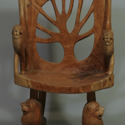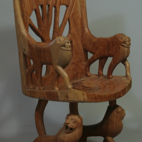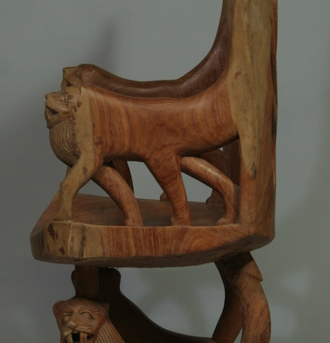 46 1/4″ tall (117.5 cm) x 21 1/2″ wide (55 cm) x 17 1/4″ seat height (44 cm) x 16″ seat depth (41 cm). All 4 lions represented on this chair are the symbol of a former ahosu (king) of the Fon people, Glele. Rare, if not unique in Africa, the Fon have a strong sense of their royal heritage, not unlike the British. They know their royal lineage. Each king has his own exclusive symbol, immediately identifiable to all Fon people. Glele was the ahosu from 1858 to 1889.